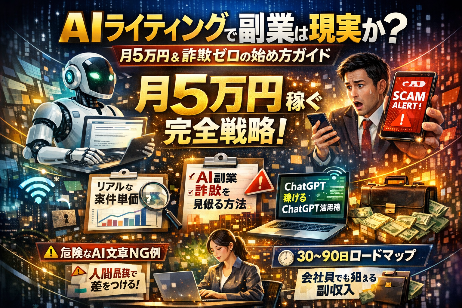 この記事では、AIライティング案件の種類と単価のリアル、ChatGPTを使った具体的な執筆フロー、AI丸出しで即NGになる文章のパターン、インスタ発の怪しいAI副業オファーの見抜き方までを一気通貫で解説します。さらに、社用PC利用や公共Wi-Fiなど、ネット上の一般論ではほとんど触れられないIT環境起因のリスクも押さえます。