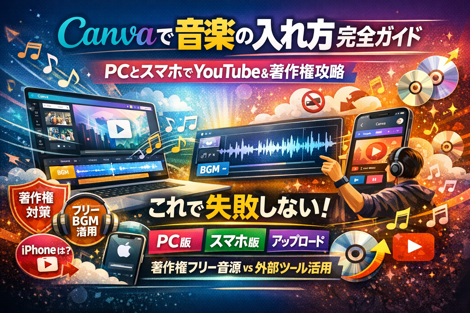 Canvaで動画に音楽を入れようとして、PCとスマホで操作が違う、iPhoneでは無料でできない、iTunesやApple Musicの曲が使えるのか分からない、YouTubeに上げたら著作権で止められた…こうしたつまずきが続くと、完成そのものが遅れます。実は、Canvaでの音楽の入れ方自体はシンプルです。パソコンでもスマホでも、オーディオタブからBGMを選んでタイムラインに配置するだけで形にはなります。問題は、その先です。iTunesやApple Music、Spotify、CDの曲は、技術的にCanvaへ持ち込めても、YouTubeやInstagramで安全に公開できるケースはごく限られます。さらに「著作権フリーだから大丈夫」と選んだ音源が、Content IDやコピーライト検出でブロックされることもあります。この記事では、PCとスマホでの具体的なCanva音楽の入れ方はもちろん、YouTubeへのアップ方法、著作権フリーBGMとCanva内ストック音源の違い、好きな音楽を使いたいときの現実的なライン、そして「Canva 音楽 アップロード 出来 ない」と表示される典型パターンまで一気に整理します。どこまでをCanvaで完結させ、どこから外部ツールを併用すべきかまで含めて、今日中に安全な一本を仕上げるための最短ルートだけに絞って解説します。