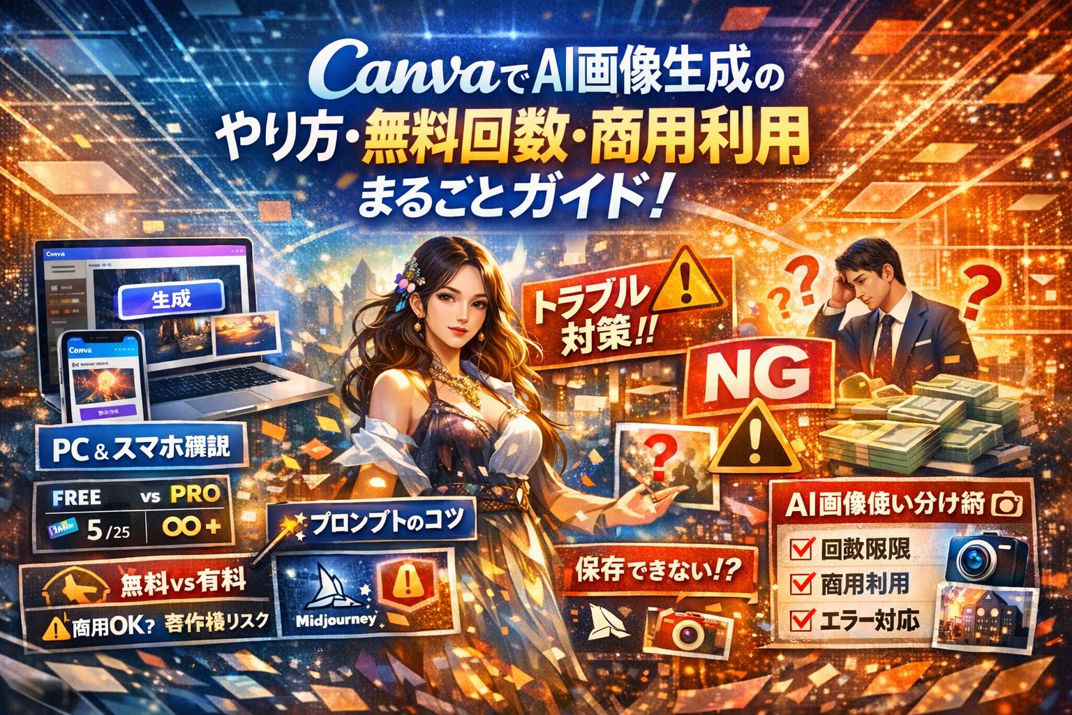 CanvaのAI画像生成を使い始めてから、便利さ以上に「細かい落とし穴」の多さに何度もひやりとさせられてきました。パソコンで作った画像がスマホでうまく開けず投稿時間がずれたり、無料回数を勘違いしてキャンペーンの本番直前に生成が止まったり、海外向け案件で人物のAI画像がパートナー側の基準に合わず、デザインを一から作り直したこともあります。操作方法だけなら公式ヘルプで足りますが、商用利用や著作権のライン、他サービスとの組み合わせ方、エラーが出たときの切り抜け方は、実際に仕事で使ってみないと見えませんでした。この記事では、自分が遠回りして学んだ「どこまでが安全で、どこからが危険か」という感覚を、パソコンとスマホ両方のつまずきポイントとあわせて整理しています。同じように不安を抱えながらCanvaを使っている人が、余計なトラブルに時間とお金を奪われず、安心してAI画像を活用できるようにしたい。その一点だけを考えて書きました。