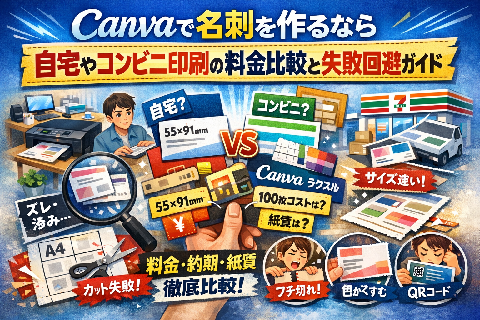 Canvaで名刺を作ろうとして、テンプレを選んで印刷方法を調べているうちに時間だけが消えていないでしょうか。自宅印刷かコンビニ印刷か、Canva印刷かラクスルか。料金も納期もバラバラのまま比較軸がないので、多くの人が「とりあえず」で決めて、フチが切れた名刺や、名刺入れに入らないサイズ違いの名刺を量産しています。しかも「Canva 名刺 作り方」や「Canva 名刺 印刷方法」で検索しても、テンプレ紹介と操作説明止まりで、日本標準55×91mmの名刺サイズ前提で、自宅・コンビニ・Canva・ラクスルを横並びで比較し、10面レイアウトのズレや色のくすみまで踏み込んだ情報はほとんどありません。この記事では、Canva名刺の作り方をテンプレとゼロから設計の両方から解剖し、A4・10面での自宅印刷やコンビニ印刷の現実的な精度、Canva名刺印刷とラクスルの料金・納期・紙質の差を、印刷現場の失敗事例とともに整理します。そのうえで、「今日中に10枚だけ欲しい副業エンジニア」「紙質重視のフリーランス講師」「ショップカードも兼ねたいサロンオーナー」それぞれにとって、どの選択肢が最もコスパのいい一手かが一目で判断できるように設計しました。この数分の読み込みで、無駄な刷り直しとモヤモヤした妥協をゼロにすることができます。
