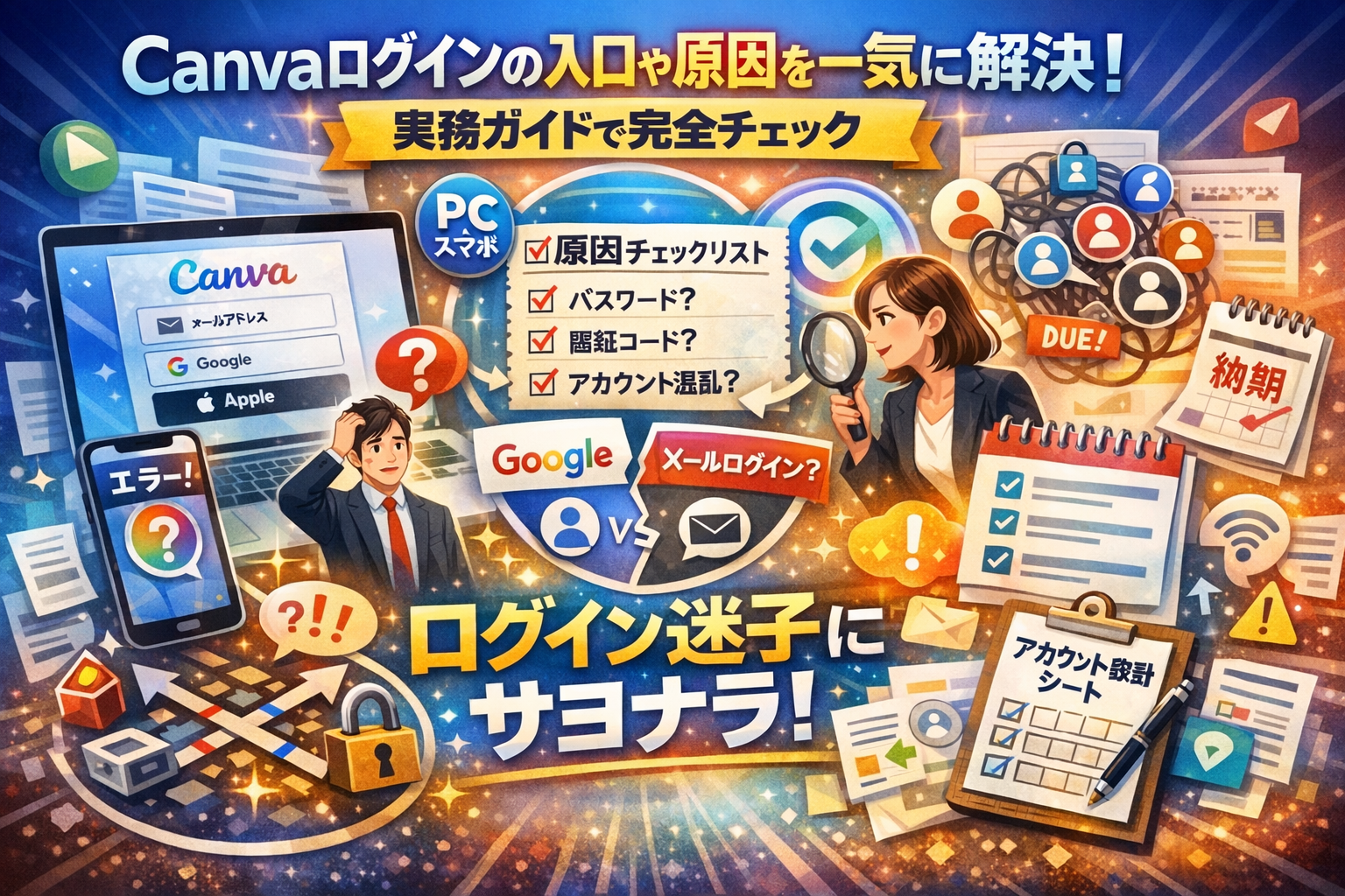 Canvaにログインできない数分で、広告の入稿や社内資料の納期は簡単に遅れます。しかも原因の多くは、サービス障害ではなく、ログイン方法の選び方とアカウント設計の甘さです。PCではメールアドレスで登録したのに、スマホアプリはGoogleで続行して別アカウントになっている。ログインコードが届かないのに、通信やブラウザを疑っていない。共有PCで複数アカウントを使い回し、誰のCanvaアカウントで課金したか分からなくなる。こうした「構造的な欠陥」は、その場しのぎのQ&Aやログイン画面への案内だけでは解消しません。
