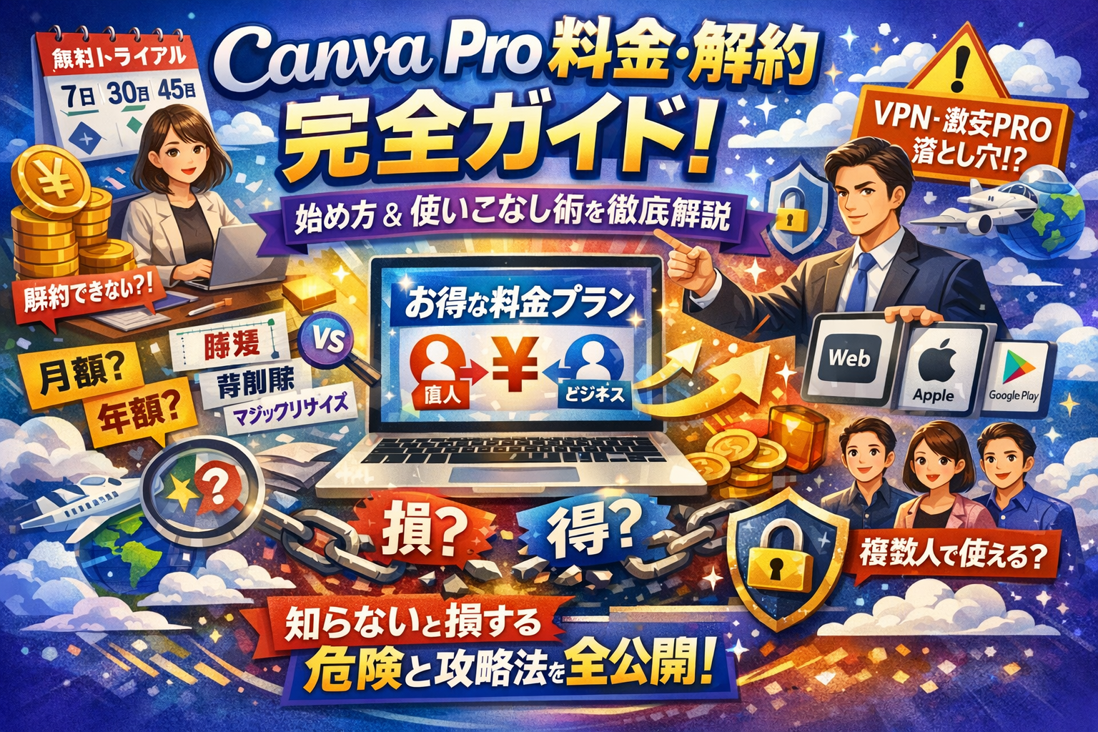 このガイドでは、Canva Pro 料金を日本円で整理し、買い切りの有無や年払い・月額の損益分岐を押さえたうえで、無料版との具体的な作業時間の差、背景リムーバーやマジックリサイズでどこまで効率が変わるかを数字ベースで明らかにします。さらに、Web/Apple/Google Playごとの解約手順、「解約できない」「請求が止まらない」時の現場での対処、Canva Pro 複数人利用やCanvaビジネスとの境界線、正攻法の割引術まで、契約から解約までのリスクとリターンを一度で把握できるよう設計しました。この記事を読み切れば、Canva Proを「なんとなく払うサブスク」から、「必要なときだけ確実に回収できる投資」に変えられます。