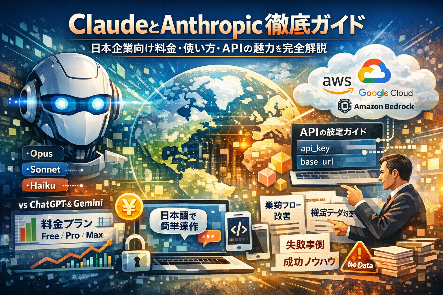 本記事では、Claudeとは何かという基本から、Opus Sonnet Haiku各モデルの使い分け、ChatGPTやGeminiとの違い、Free Pro Maxの料金とAPI料金の目安までを一気に整理します。そのうえで、Claudeアプリのインストールとログイン、日本語での具体的な使い方、Claude Anthropic api_keyやbase_urlの扱い、Amazon BedrockやAWS Google Cloudとの連携を、現場の視点で解像度高く解説します。
