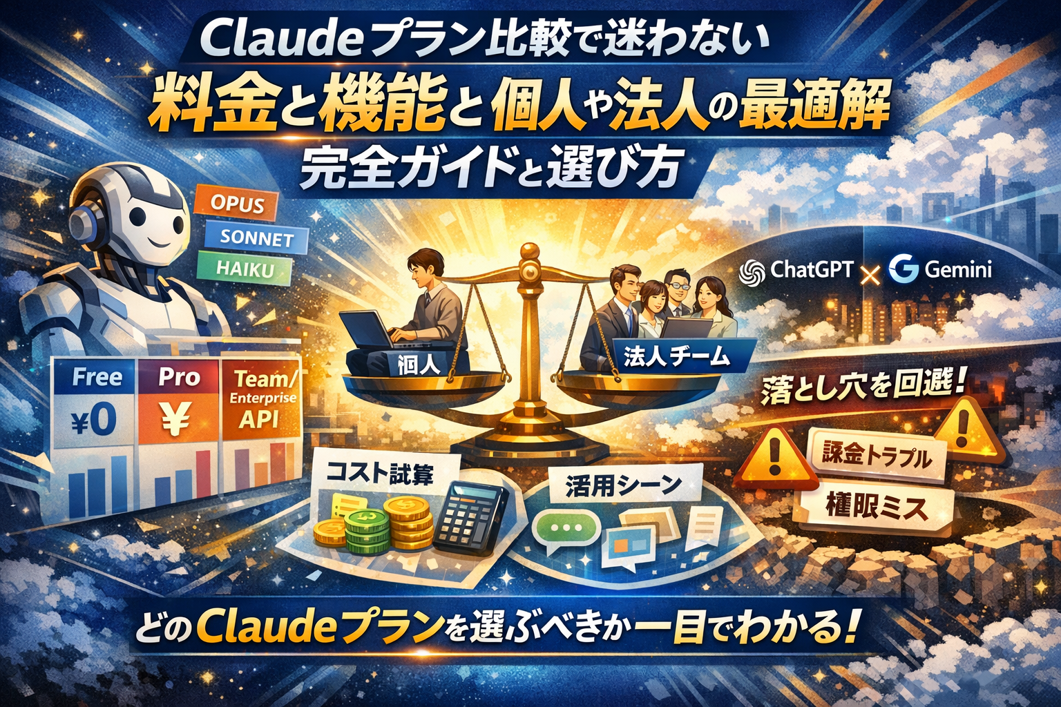 本記事は、Claudeプランの違いをモデル(Opus/Sonnet/Haiku)や使用制限まで含めて整理し、日本円ベースでProやMax、Team、APIの1人あたり・1案件あたりのコスト感をつかめるように設計しています。そのうえで、個人、5名前後の開発チーム、中小企業の部署といった具体シナリオごとに、Claude ProやMax、Teamプラン、APIの最適な組み合わせを提示し、ChatGPTやGeminiとの役割分担まで踏み込んで解説します。さらに、Freeから有料プラン変更時の落とし穴、Claude Codeを前提にしたプラン選び、請求と権限設計で失敗しないためのチェックポイントまでカバーすることで、「どのClaudeプランをどう組み合わせれば、自社のコストと生産性が最も改善するか」を短時間で判断できる状態まで導きます。