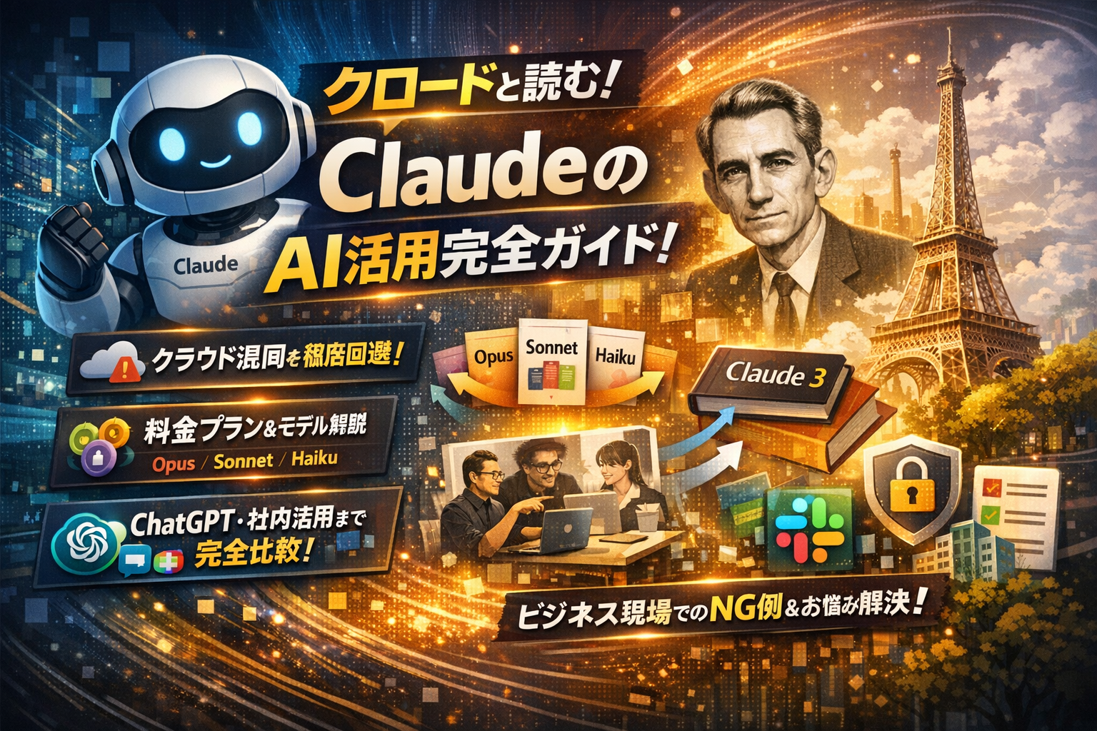 検索でよく出てくる情報も、クロードという読み方やAIとしての概要、料金プランやChatGPTとの違いにとどまりがちです。本記事ではそれらを一気に整理しつつ、フランス語の人名としての意味やClaude Shannonとの由来、Claude 3 Opus/Sonnet/Haikuといったモデル名の読み方まで先に片付けます。その上で、無料版とProの分かれ目、ChatGPTやGeminiとの比較、日本語での具体的な使い方、Slackや社内チャット連携までを業務目線で解説します。