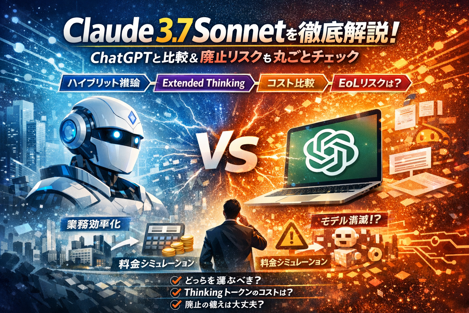 本記事では、Claude 3.7 Sonnetの位置づけや性能を押さえたうえで、ChatGPTやSonnet4/Opusとの用途別比較、料金と無料枠の現実、extended thinkingのコスト爆発リスク、さらにEoLを前提にしたエージェント設計や外部ツール連携まで、一連のロジックとして整理します。人事・法務・経理・マーケの具体的な活用例や、アカウント管理と請求トラブルの回避策も含めて、「どのモデルを、どの業務に、どこまで任せるか」を決め切るための材料を一気に手にしていただけます。