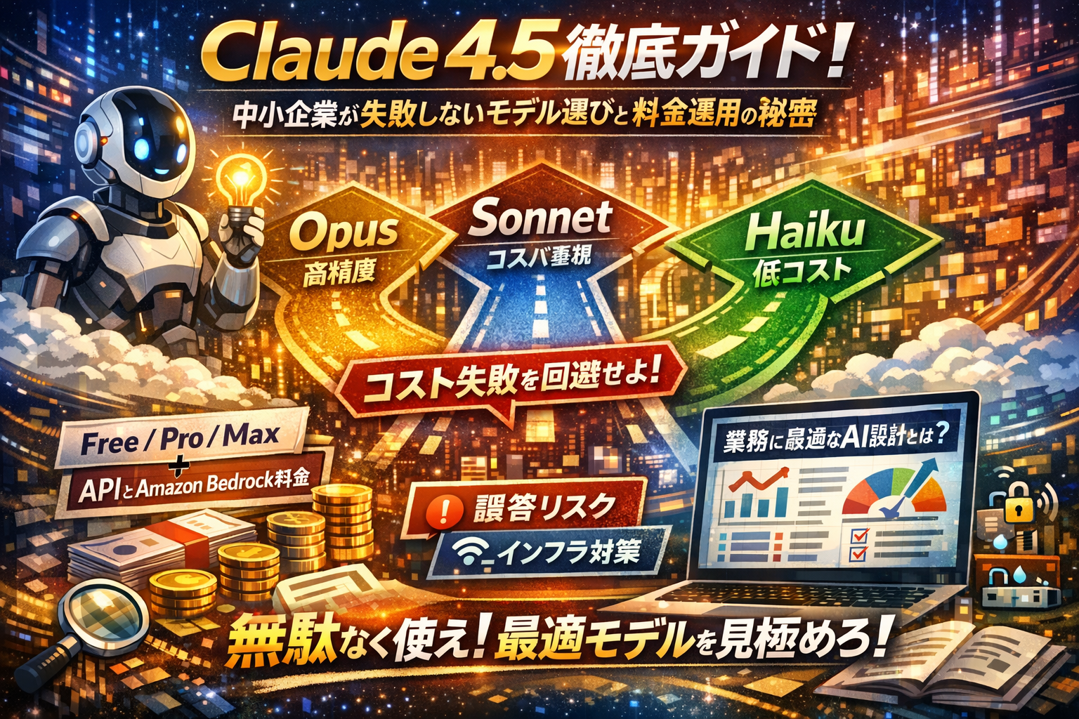 本記事では、Claude 4.5 Sonnet/Opus/Haikuの違いを、ベンチマークではなく実際の業務タスクと誤回答リスクから整理します。Web版のFree/Pro/MaxとAPI、Amazon Bedrockの料金を踏まえ、「安く始めて高くつく」典型パターンと避け方を具体化します。さらに、ChatGPTとの住み分け、エージェントやSDK導入前に必須の社内ルール、回線・端末・権限といったインフラ面まで含めて、中小企業がClaude 4.5を現場で“普通に使いこなす”ための実務ロジックを一気にまとめました。