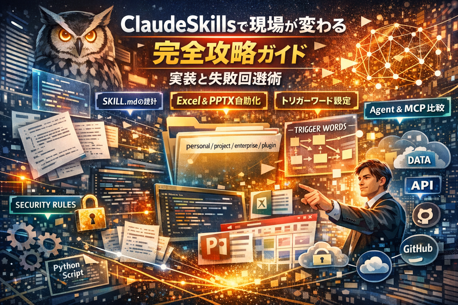 本記事では、Claude Skillsとは何かから、personal/project/enterprise/pluginごとのディレクトリ構成、SKILL.mdのフロントマターとdescription、トリガーワード設計、Progressive Disclosureによるコンテキスト注入の仕組みまでを一気通貫で整理します。そのうえで、Excelやpptx、コードレビューの具体例やおすすめSkills一覧、GitHubやmarketplace的な公開スキルの活用法、MCPやRAG、Agent Skills/SubAgentとの違いと役割分担を、Claudeアプリ・Claude Code・APIのそれぞれの現場に引き寄せて解説します。