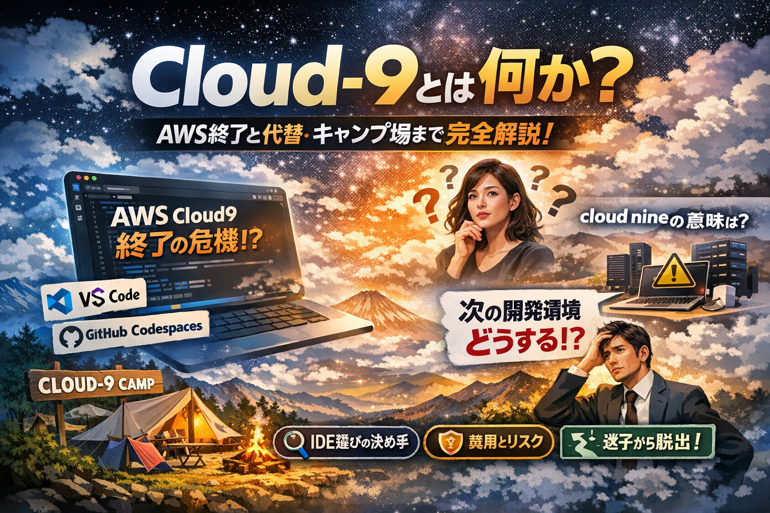 このあと、AWS Cloud9の仕組みや終了リスク、VS CodeやGitHub Codespacesへの移行、そしてキャンプ場や英語表現としてのcloud nineまで、一気に「迷子にならないルート」で案内していきます。