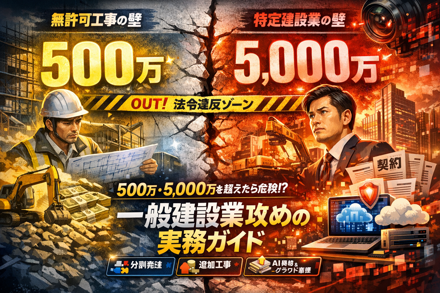 一般建設業許可でどこまで請負金額を攻めてよいのか曖昧なまま進めると、気付かないうちに「売上の天井」と「法令違反リスク」の両方を抱え込むことになります。よく知られている通り、一般建設業許可自体には請負金額の上限はありません。1億円の工事を請け負うことも可能です。ところが実務では、無許可工事の500万円ルールと、下請代金5,000万円(建築一式8,000万円)を超えると特定建設業許可が必要になるラインが、元請・下請・追加工事・分割契約の組み合わせで簡単に踏み越えられます。しかも、「500万円を超えないよう分割」「名義を借りて下請に出す」といった発想は、いま行政や金融機関から最も疑われやすい領域です。本記事では、この500万円と5,000万円の本当の意味を、元請・下請・孫請の立場別に整理し、「どこからがアウトか」を具体的なケースで示します。そのうえで、見積・契約・追加工事・請求をクラウドやAIで一元管理し、ヒューマンエラーに頼らず金額ルールを自動監視する方法まで踏み込みます。一般建設業許可で売上を伸ばしつつ、特定建設業許可へのステップアップも視野に入れるなら、今の管理のまま走り続けることが最大の損失になります。ここで自社の「金額ライン管理」を根本から組み替える前提知識を押さえてください。