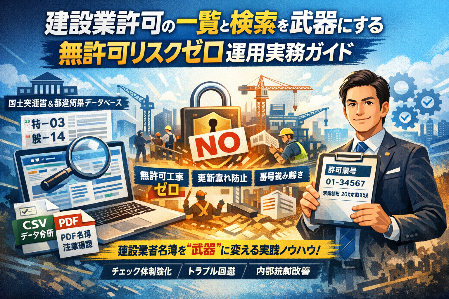 建設会社の基幹システムや取引先管理の相談を受ける中で、「協力会社の建設業許可は確認しているつもりだったが、後から無許可期間が見つかった」「PDF名簿を目視で追っていて更新切れを見落とした」という声を何度も聞いてきました。僕自身、支援先の取引先マスタに許可番号と有効期限の項目を追加した際、国交省の検索システムと都道府県の名簿で入力形式が違い、Excelの並び替えミスから同名別会社を紐づけてしまったことがあります。社内にIT担当がいない中小の現場では、名簿の略号や番号の意味よりも、「どの画面をどんな頻度で見れば、無許可リスクを日常業務の中でつぶせるか」が分からず手が止まりがちです。このギャップを埋めるため、700社以上を支援してきた中で現場と一緒に組んだチェック手順や、PDF名簿をCSVに変えて年1回の一括確認までつなげた流れを、一つの実務ガイドとして整理しました。ITが得意でない総務や現場でも、今日から自社のルールに落とし込める形で届けたいと思い、本記事を書いています。