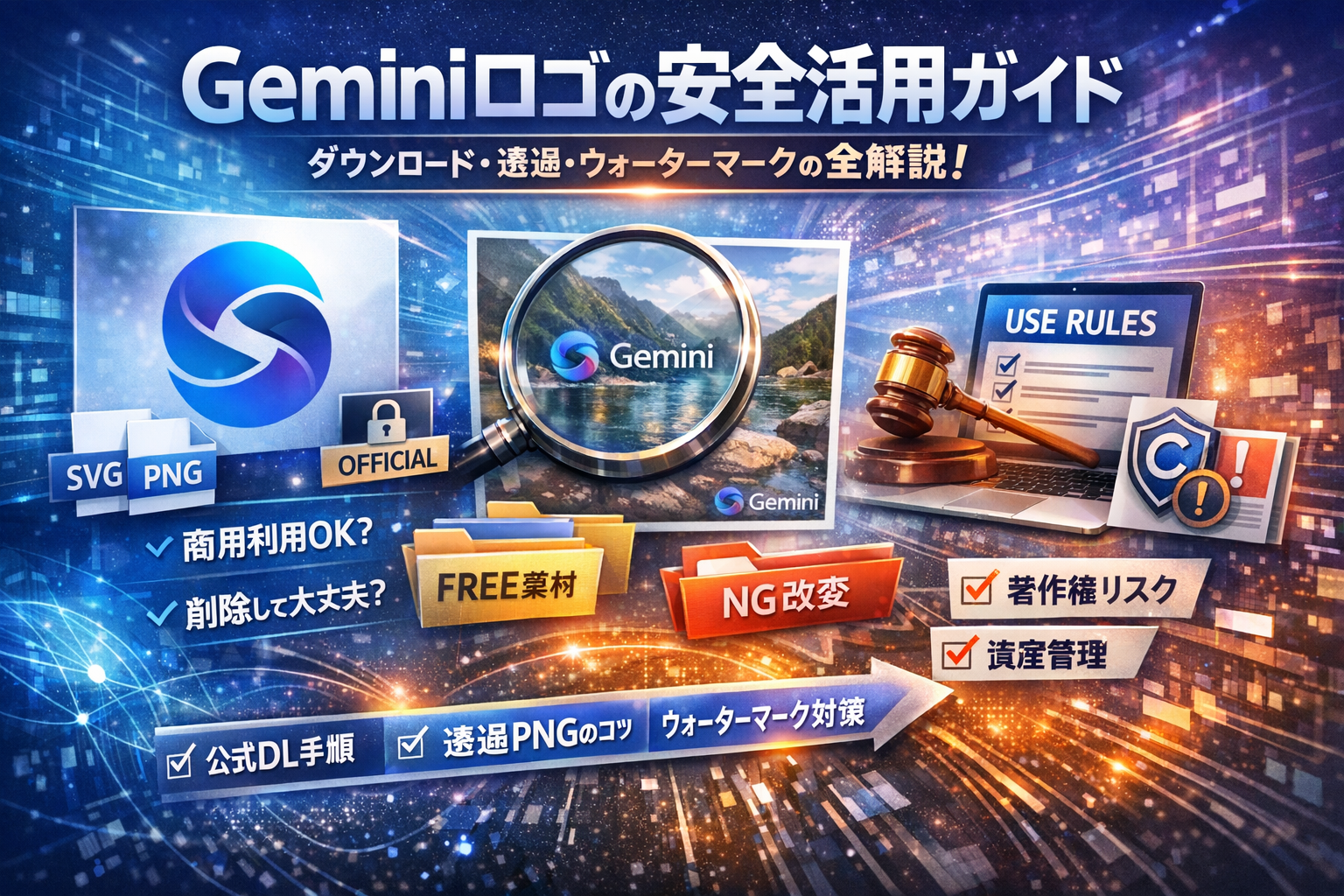 本記事では、Google Geminiロゴと「gemini」という言葉のロゴの違い、公式ロゴとLobeHubなどのフリーアイコンの線引き、ウォーターマークを消す・見えなくする行為のリスク、Geminiロゴ作成プロンプトや背景透過PNGの実務手順まで、Web担当者が今日から判断と運用を誤らないための基準を一気に整理します。Geminiロゴ 公式ダウンロードやガイドライン、フリー素材やpng検索で情報が分散している状態を、1本の基準にまとめ直すことで、「あとから全差し替え」「炎上」「審査落ち」を防ぎ、ロゴとAI画像を会社の資産として守れるようになるはずです。