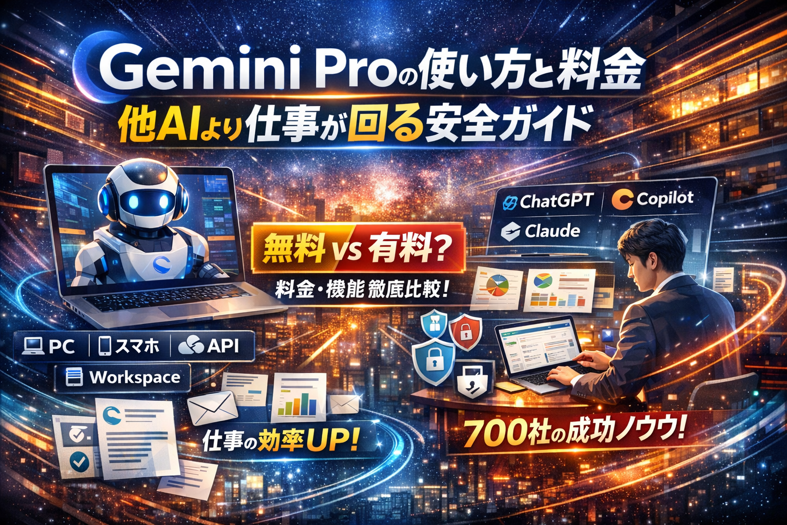 バックオフィスや営業現場、個人クリエイターがどのタスクをGemini Proに任せ、どこから先は任せてはいけないのか。他のAI(ChatGPT/Copilot/Claude)とどう組み合わせると、最小の課金で最大の成果と安全性を両立できるのか。700社超のIT支援現場で見えてきた失敗パターンと運用ルールまで含めて、ひとつの導線で解説します。Gemini Proを「なんとなく触る段階」で止めるか、「業務フローに組み込んで成果を出す」かが、この先数十分の読み方で決まります。