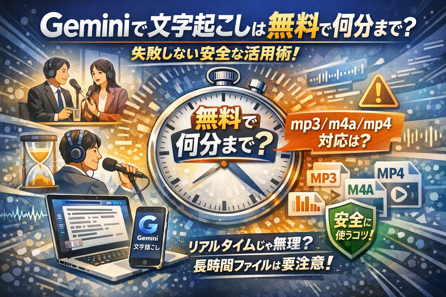 この記事では「Gemini 文字起こし やり方」を、PCとスマホの最短STEPに落とし込みつつ、「無料でどこまで」「何分まで」「どの形式まで」が現実的かをまず整理します。そのうえで、会議・インタビュー・YouTube・セミナー向けの具体的なプロンプト例、1時間超の音声を分割して処理する現場向けワークフロー、mp3/mp4/m4aで「できない」と言われたときの逃げ道まで解説します。さらに、Geminiに学習させない設定や情報漏洩リスクへの向き合い方、専用AI文字起こしツールとの比較、バックオフィスやフリーランスが実務で回せる業務フローまでを一気通貫で示します。「とりあえずAIで文字起こし」は、もうやめたい方だけ読み進めてください。