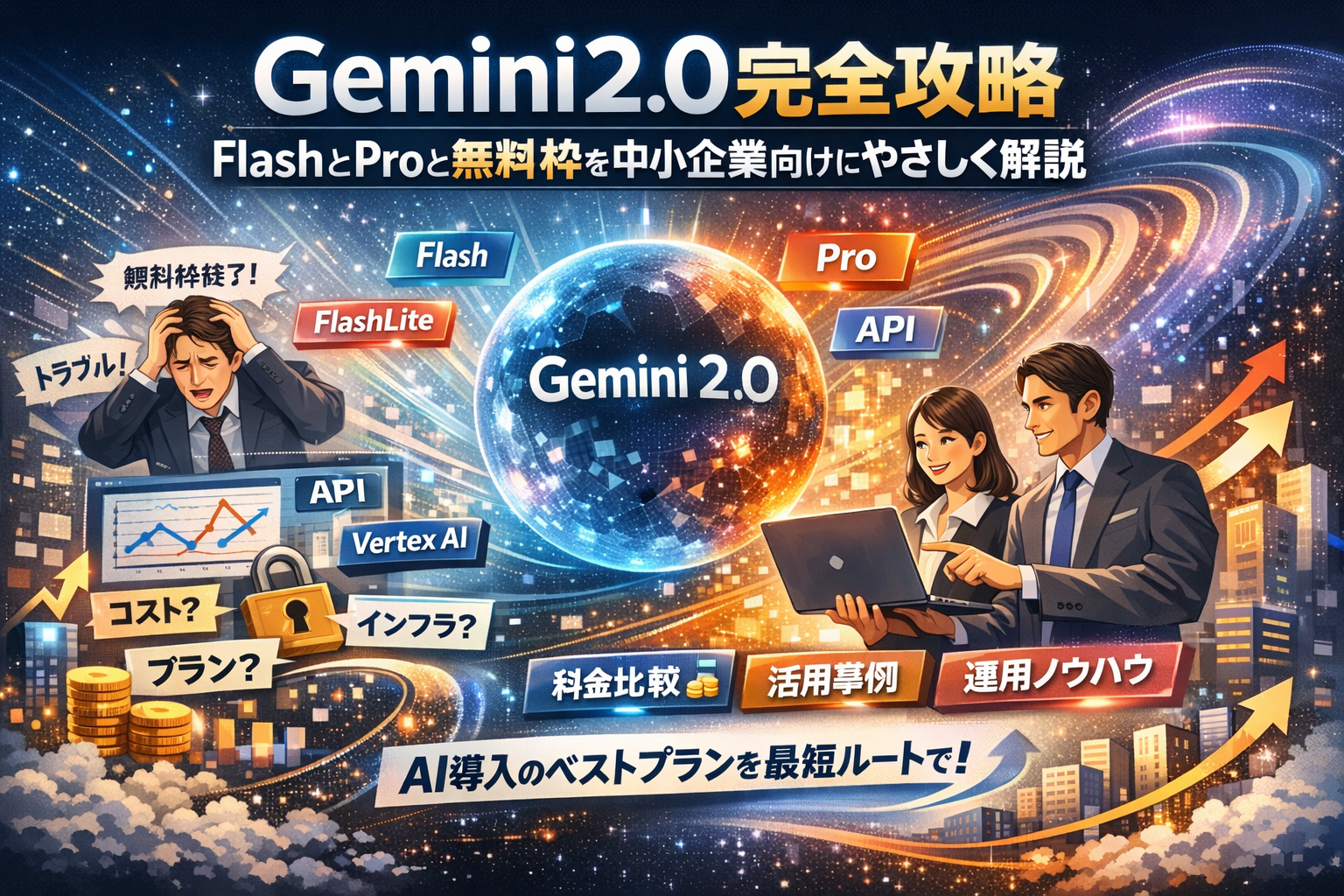 本記事では、Gemini 2.0 FlashとPro、FlashLite、FlashThinkingExperimentalの役割と境界線を現場目線で整理し、チャット版とGemini 2.0 Flash API、Vertex AIの料金と無料枠の実態を明確にします。その上で、社員数やユースケース別に「どのモデルを選ぶか」、言語混入やプレビュー版終了といったトラブルをどう避けるか、PCや回線、ブラウザ、社内セキュリティポリシーといったインフラまで踏み込んで解説します。Gemini 2.0を軸にAI導入を進めるか迷っている情シス・業務改善担当の方にとって、本記事は無料検証で迷走せず、本番運用まで最短距離で到達するための実務ロードマップになります。