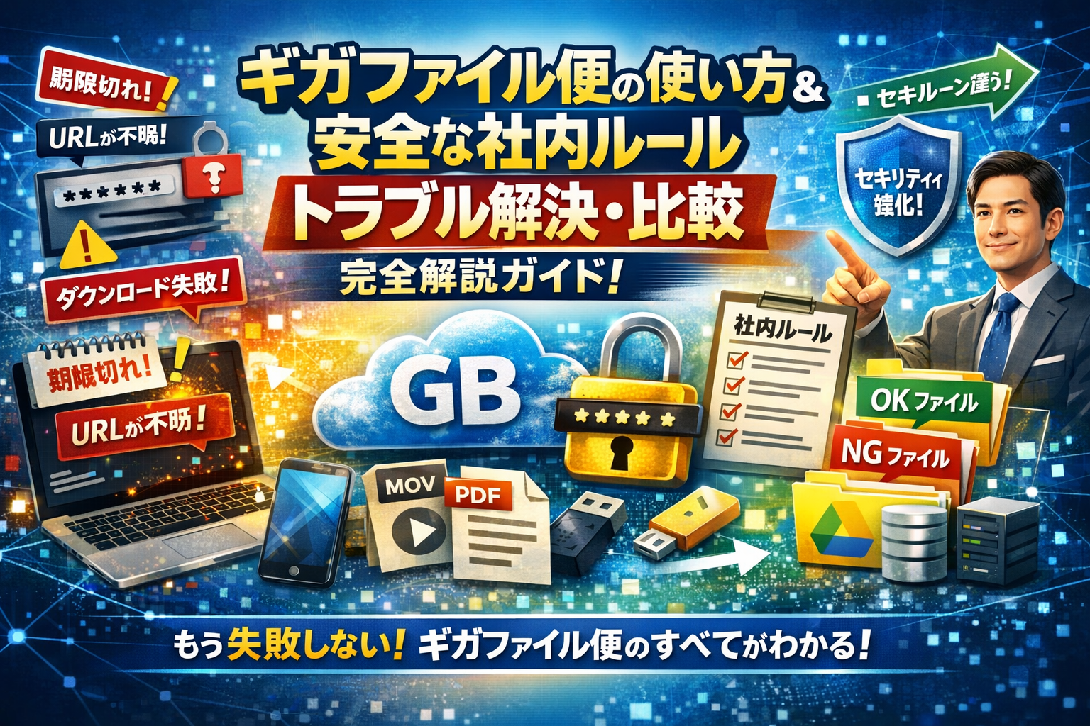 本ガイドでは、ギガファイル便の仕組みと特徴を整理したうえで、パソコンとスマホ(iPhone/Android)それぞれの具体的な使い方、動画や写真、PDF資料の送り方、ギガファイル便がアップロードできない・遅い・固まるときの原因と解決策を、現場でそのまま使える形で解説します。さらに、URLとパスワードの管理ミスで起きがちな事故例、バックアップ代わりに使ってデータが消えるパターン、中小企業や制作会社が実際に運用している「載せてよいファイル/載せないファイル」の線引きと台帳管理テンプレート、Googleドライブや社内ストレージとの役割分担まで一気に整理します。