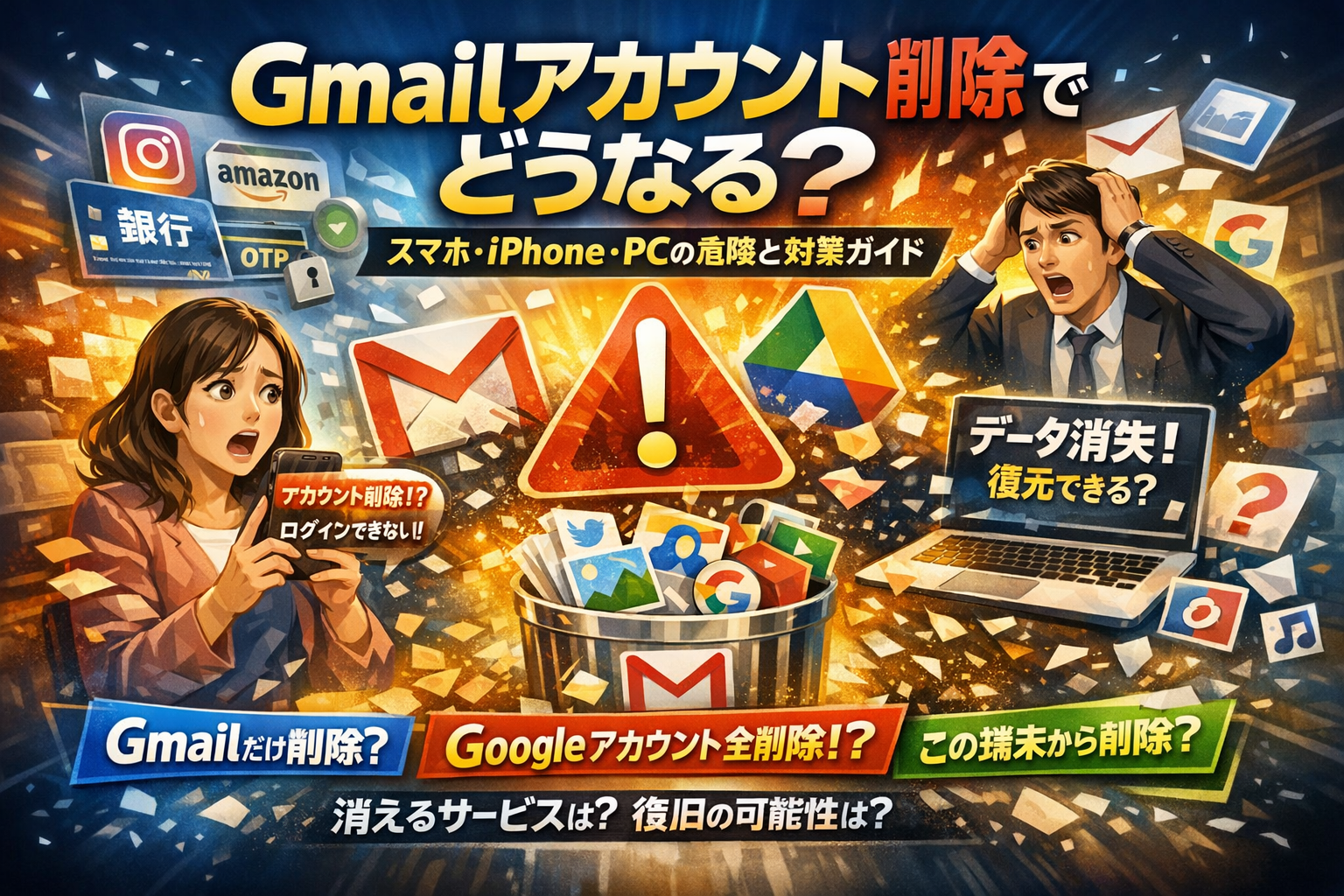 Gmailアカウントを削除したらどうなるかを曖昧なまま操作すると、気付かないうちにインスタや楽天のログイン、銀行やクレジットカードのワンタイムパスワード、GoogleフォトやGoogleドライブの写真・ファイルまで一気に失う可能性があります。しかもややこしいのは、Gmailだけ削除する場合と、Googleアカウント自体を削除する場合、さらに「このデバイスから削除」で端末からログアウトする場合では、影響範囲がまったく違うことです。スマホやiPhone、パソコン、会社PCで同じ「削除」という言葉が出てきても、中身は別物です。この記事では、Gmailアカウント削除したらどうなるかを3パターンに分解し、AndroidやiPhone、パソコン別に「どこまで消えるか」を具体的に整理します。そのうえで、使わないアカウント削除と放置どちらが安全か、削除前に必ずやるべきデータ保存とチェック、誤ってGoogleアカウント削除してしまった時の復元可否、会社PCや古いスマホで「このデバイスから削除」しても他の端末はどうなるかまで、知恵袋では断片的にしか拾えない部分を一気に解消します。この記事を読み終える頃には、自分のケースで本当に選ぶべきのは「削除」か「ログアウト」かが迷わず判断できる状態になっているはずです。