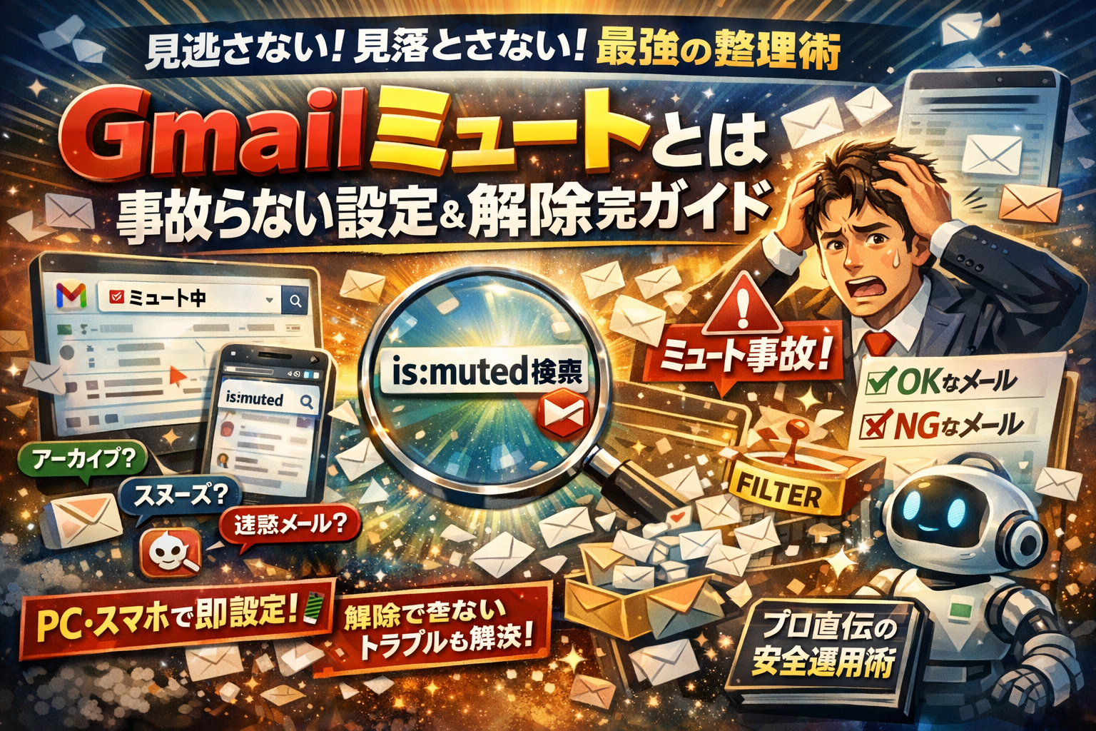 この記事では、Gmailミュートとは何かを定義と挙動レベルで正しく整理しつつ、PCとスマホ(iPhone含む)での設定と解除、is:muted検索、アーカイブやスヌーズ、迷惑メール、ブロックとの違いまで一気に解体します。さらに、現場で実際に起きた「ミュート事故」を踏まえ、どのメールはミュートしてよくて、どこから先は絶対に触ってはいけないのかを具体的な線引きで示します。