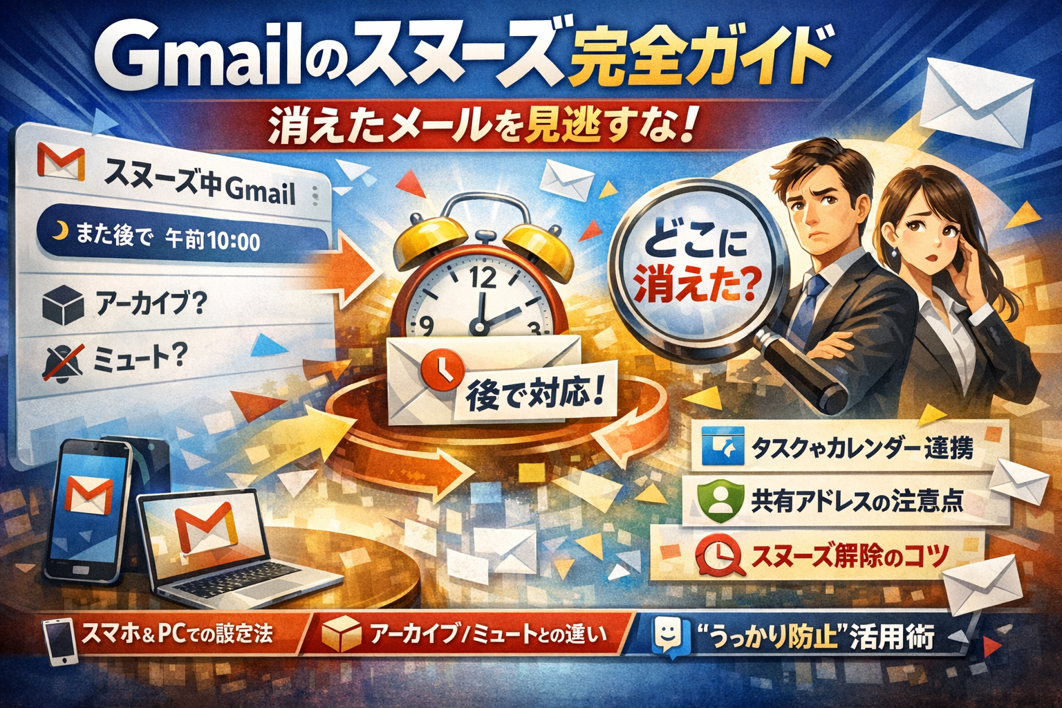 この記事では、PCとスマホでのGmailスヌーズ設定と解除の最短ルートを押さえつつ、スヌーズ中非表示になったメールの確認方法、Gmailアーカイブどこ問題やミュート解除スマホの落とし穴まで、現場で本当に起きているパターンを前提に整理します。さらに、代表アドレスや共有メールボックスでスヌーズを使うリスク、タスクやカレンダーとの境界線、AIやGeminiと組み合わせる際の運用ルールまで踏み込みます。
