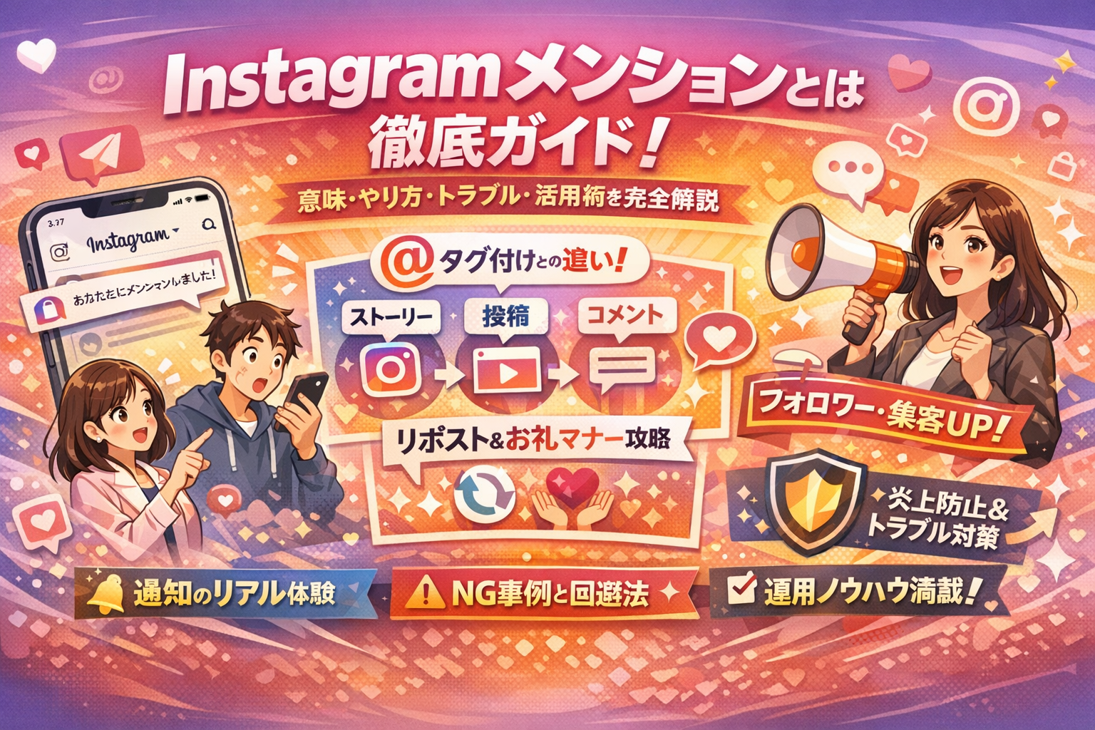 合わせて、「インスタでメンションするにはどうすればいいか」「インスタメンションされたらどうすればいいのか」「インスタストーリー メンションをリポストできない・ストーリーに追加できない原因はどこか」といった再検索ワードのつまずきを、端末や通信、アカウント設定まで含めたチェックポイントとしてまとめています。