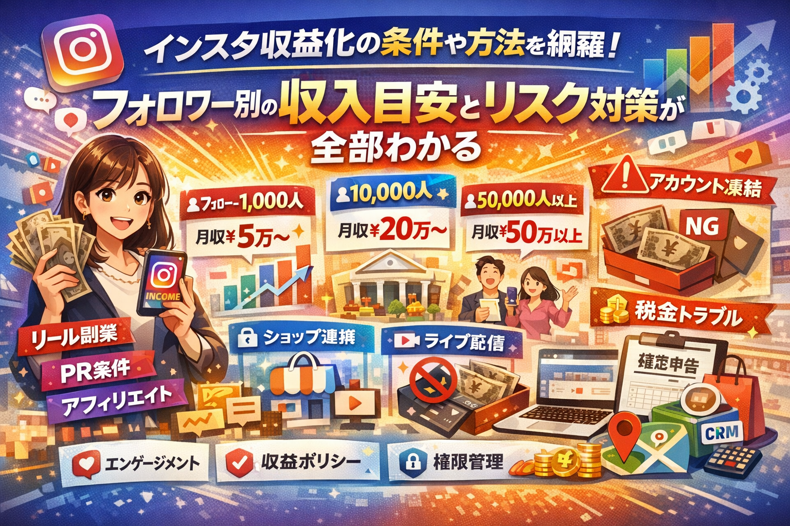 本記事では、主婦や個人の副業アカウント、店舗や中小企業、リールに強いクリエイターまでを想定し、インスタ収益化の条件ややり方、フォロワー別の収入目安、インスタリール収益やアフィリエイト、企業PR案件、ショップ機能とEC連携の具体的な使い分けを整理します。そのうえで、GoogleマップやCRM、予約システム、AIツールとつなげて「売上と利益が増えるアカウント運用」に変えるための実務ロジックを提示します。インスタで本気で収益を上げたいなら、ここから先を飛ばすと判断を誤ります。