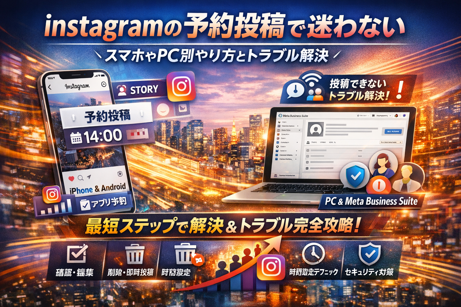 本記事では、Instagram公式アプリとPCブラウザ、Meta Business Suiteを使った予約投稿の最短手順を端末別に整理しつつ、「確認・編集・削除・今すぐ投稿」までを一気に解決します。そのうえで、「予約投稿できない」時にプロが見るチェックポイントや、無料のインスタ自動投稿アプリに潜むセキュリティリスク、予約投稿がリーチやエンゲージメントを下げないための時間指定の考え方まで、実務で使えるロジックだけを抽出しました。