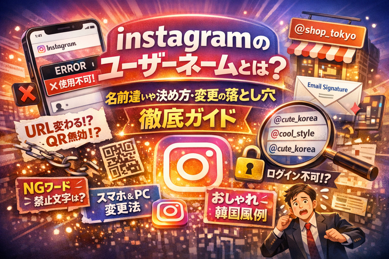instagramのユーザーネームとは何かを曖昧なまま決めると、あとから検索に出づらい、変更でURLやQRコードが一気に無効になる、「このユーザーネームは使用できません」と表示されて先に進めない、といった目に見えにくい損失が積み上がります。しかも多くの解説は、インスタの基本仕様や変更方法だけで終わり、プロフィールURLやメール署名、店頭ポップ、社内マニュアルなど、ビジネス現場で本当に困るポイントまでは踏み込んでいません。