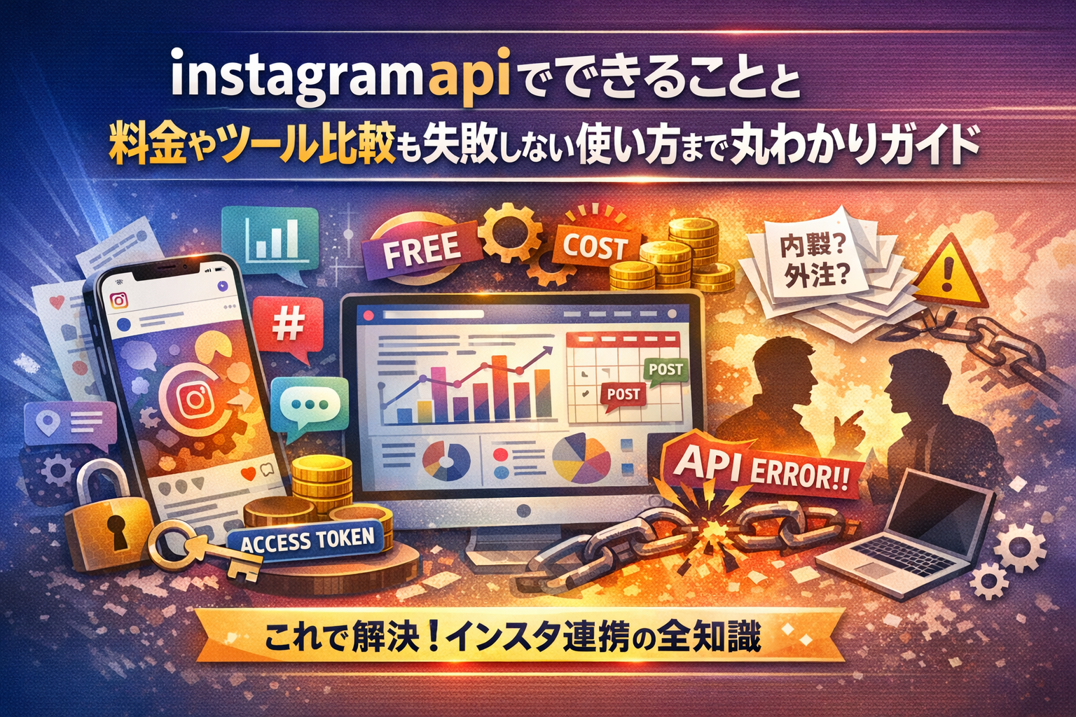 Instagram APIで投稿取得やデータ取得、自動投稿まで一気に進めたいのに、「instagram graph api」「インスタ api できること」「料金やツール比較」を調べても、断片的な情報ばかりで設計の判断材料が揃わないまま進行していませんか。実際のトラブルは、仕様よりもアカウントと権限設計やアクセストークン運用の甘さから発生し、気付いたらWebサイトのfeed instagram apiが真っ白、担当退職でfacebook api instagram連携に誰もログインできない、といった形で現れます。さらに「Instagram APIは無料」という言葉だけを信じて動くと、要件定義や検証、障害対応にかかる工数が静かにコストを押し上げます。この記事では、instagram apiとは何かから、Instagram Graph APIで本当に取得できる情報、自動投稿の現実的なライン、api連携と無料ツール・有料SNS管理ツール・自社開発の損益分岐点まで、中小企業の現場で実際に起きたパターンを基準に整理します。そのうえで、エンジニアに渡せる要件テンプレと、内製か外注かを即決するチェックポイントまで一気通貫で示します。読み終える頃には、「自社はどこまでinstagram apiを使い、どこからツールに任せるべきか」がはっきり言語化できるはずです。