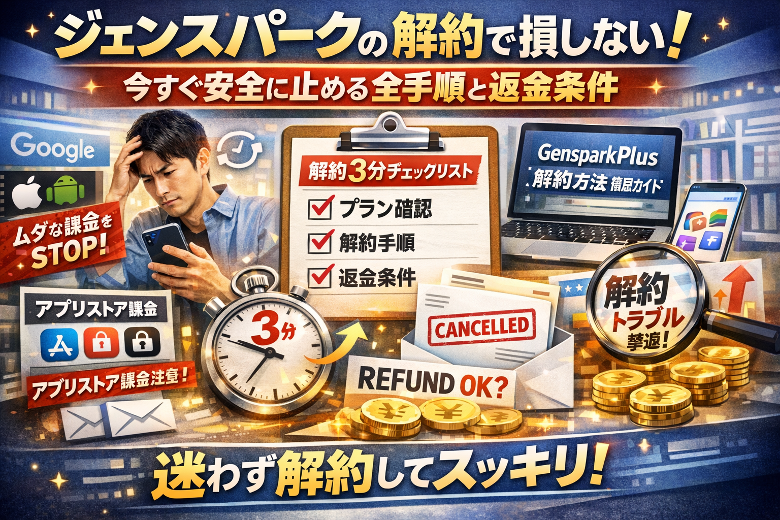 本記事では、Webとスマホのジェンスパーク有料プラン解約を3分で終わらせるチェックリストから入り、スクショ級に細かいGensparkPlus解約手順、「Genspark 解約できない」典型トラブルの潰し方、途中解約でいくら戻るかの現実的なラインを、実務ロジックだけで整理します。さらに、Gensparkサブスク解約とアカウント削除の違い、問い合わせやカード会社を動かす前に残すべき証拠、PerplexityやGrokなど他AIサブスクとのコスパ比較まで一気通貫で扱います。この記事を読み切れば、「ジェンスパーク ai 解約」「ジェンスパーク 有料 解約」で迷子になる余地を潰し、今後のサブスクでも同じ失敗を繰り返さないための基準が手元に残ります。