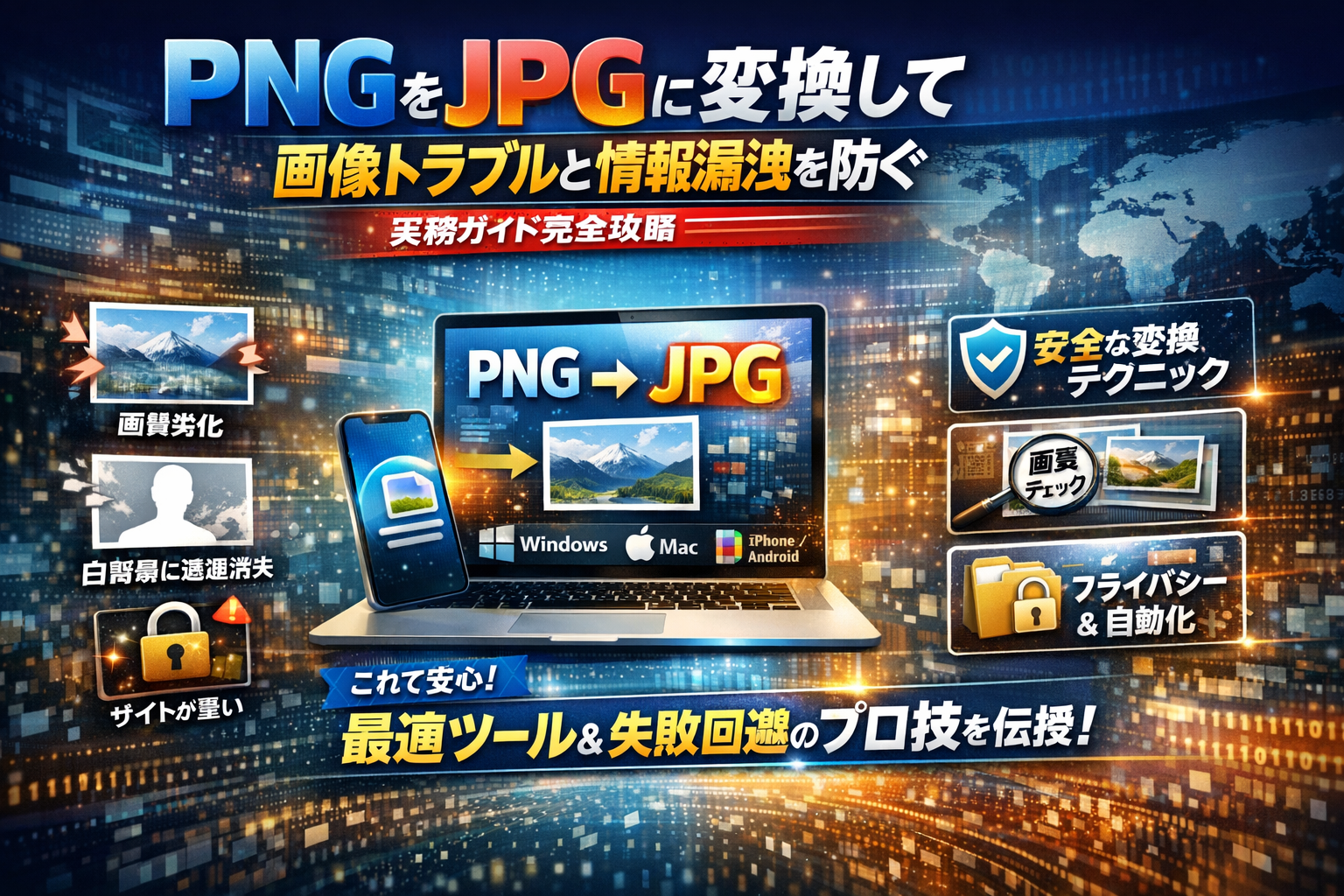 PNGをJPGに変換するたびに「とりあえず無料のオンラインツール」で済ませているなら、すでに見えない損失が出ています。画像が荒れる、透過PNGが白背景になる、サイトが重くなる、顧客写真をオンラインにアップしてしまう。原因の多くは、どのデバイスで、どのツールを使い、どの形式を選ぶかという判断軸がないことです。