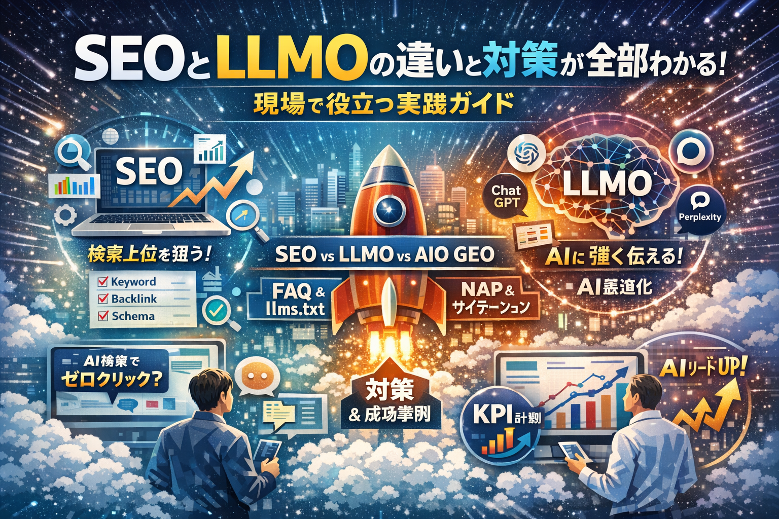 単なる用語解説やチェックリストではなく、SEOとLLMOの役割分担、AIOやGEOとの線引き、AI経由リードのKPI設計までを一本の戦略としてつなげることで、「今どこまで投資し、何を捨てるか」を判断できる状態まで引き上げます。この記事を読み終える頃には、SEOとLLMOを分けて悩む時間そのものが、事業にとっての損失だと明確に理解できているはずです。