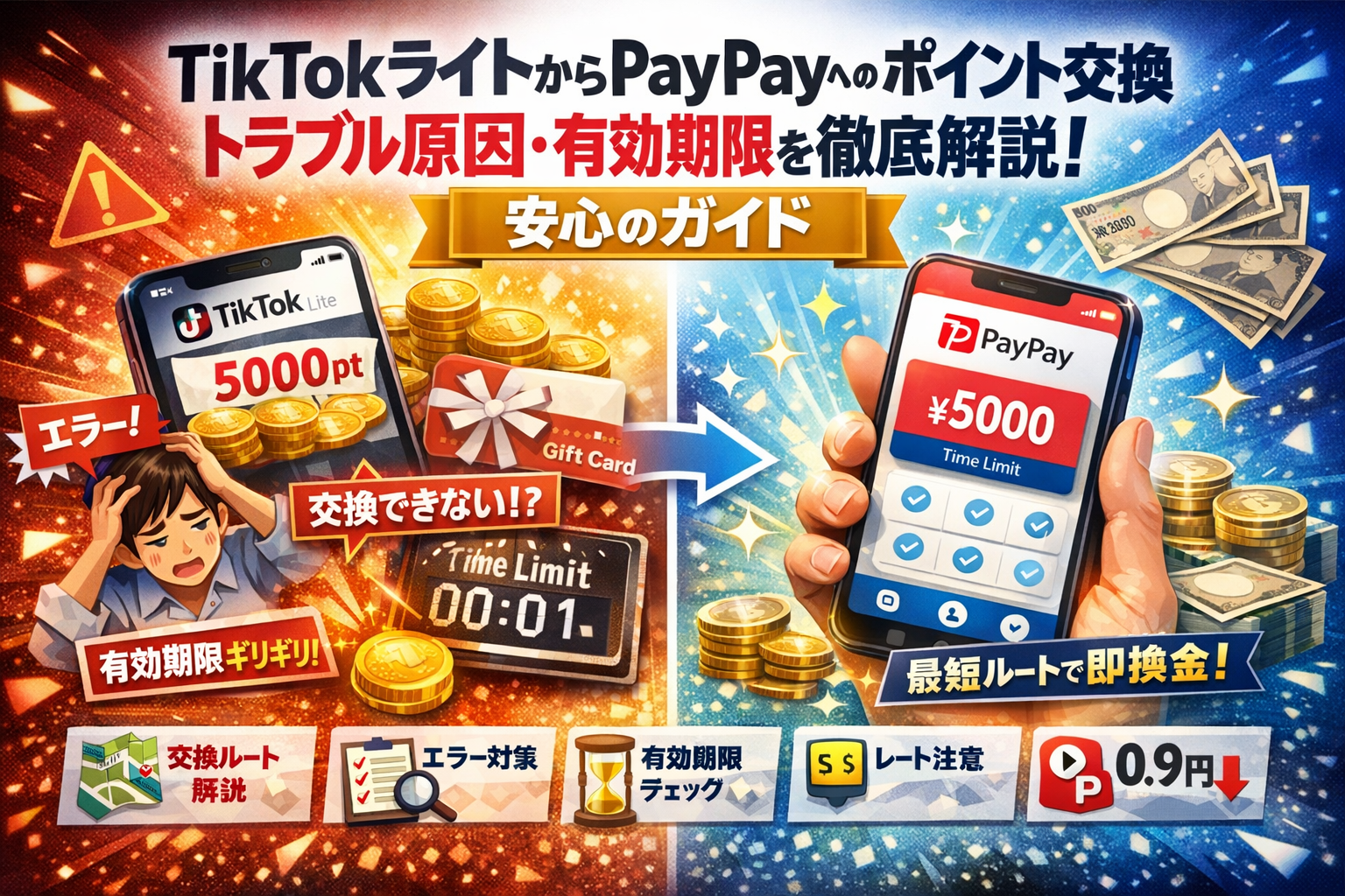 この記事を読み進めれば、「tiktokライト paypay交換方法」「交換できない」「ポイント有効期限」「怪しい」といった再検索を繰り返さずに、今あるポイントを確実にPayPay残高へ変えるための最短ルートが手に入ります。読み飛ばすこと自体が、そのままポイントの失効リスクになる内容です。