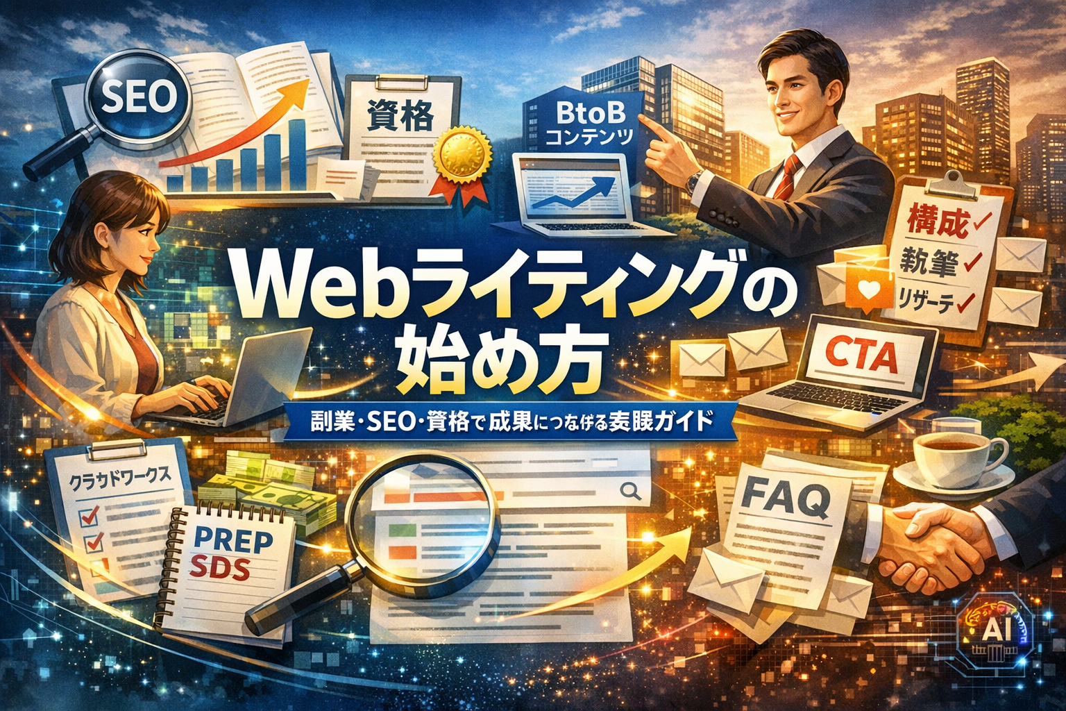 本記事は、webライティングとは何かという基本から、記事ライティングとコンテンツライティングの違い、SEOライティングの考え方、クラウドワークスでの始め方、副業で月いくらを狙えるか、「Webライターやめとけ」と言われる理由までを一気通貫で整理します。さらに、webライティング能力検定やwebライティング技能検定などの資格をどう位置づけるべきか、BtoB企業サイトやオウンドメディアで問い合わせや資料請求につなげるライティング、FAQやお知らせ文でトラブルを生まない実務のコツまで踏み込みます。