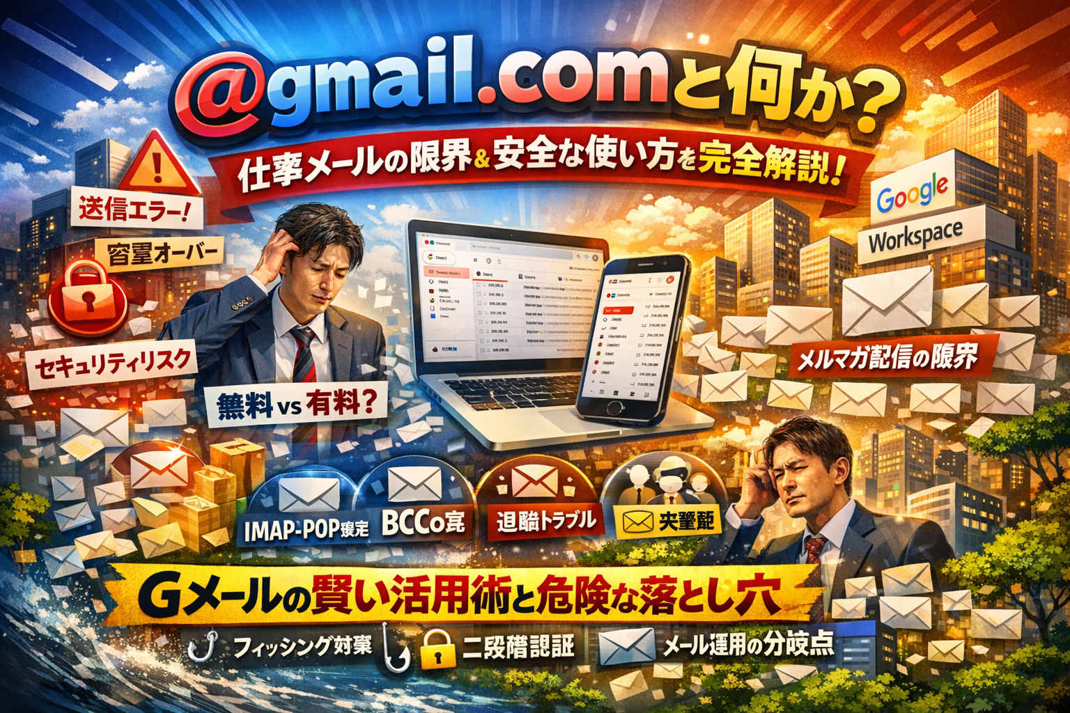 本記事では、「gメールとは何か」「gmailアドレスを作るには」「gmailを見るには」といった超基本から、スマホとPCでの設定、IMAPとPOPの違い、無料版GmailとGoogleWorkspaceの実務的な差、メルマガや代表メールで使う際の限界点までを一気通貫で整理します。読み終えたときには、個人利用からビジネス利用まで「どこまでGmailに任せてよくて、どこから配信システムや独自ドメインが必要か」を自分で判断できる状態になります。Gmailをすでに仕事で使っているなら、この記事を読まずに運用を続けること自体がリスクになります。
