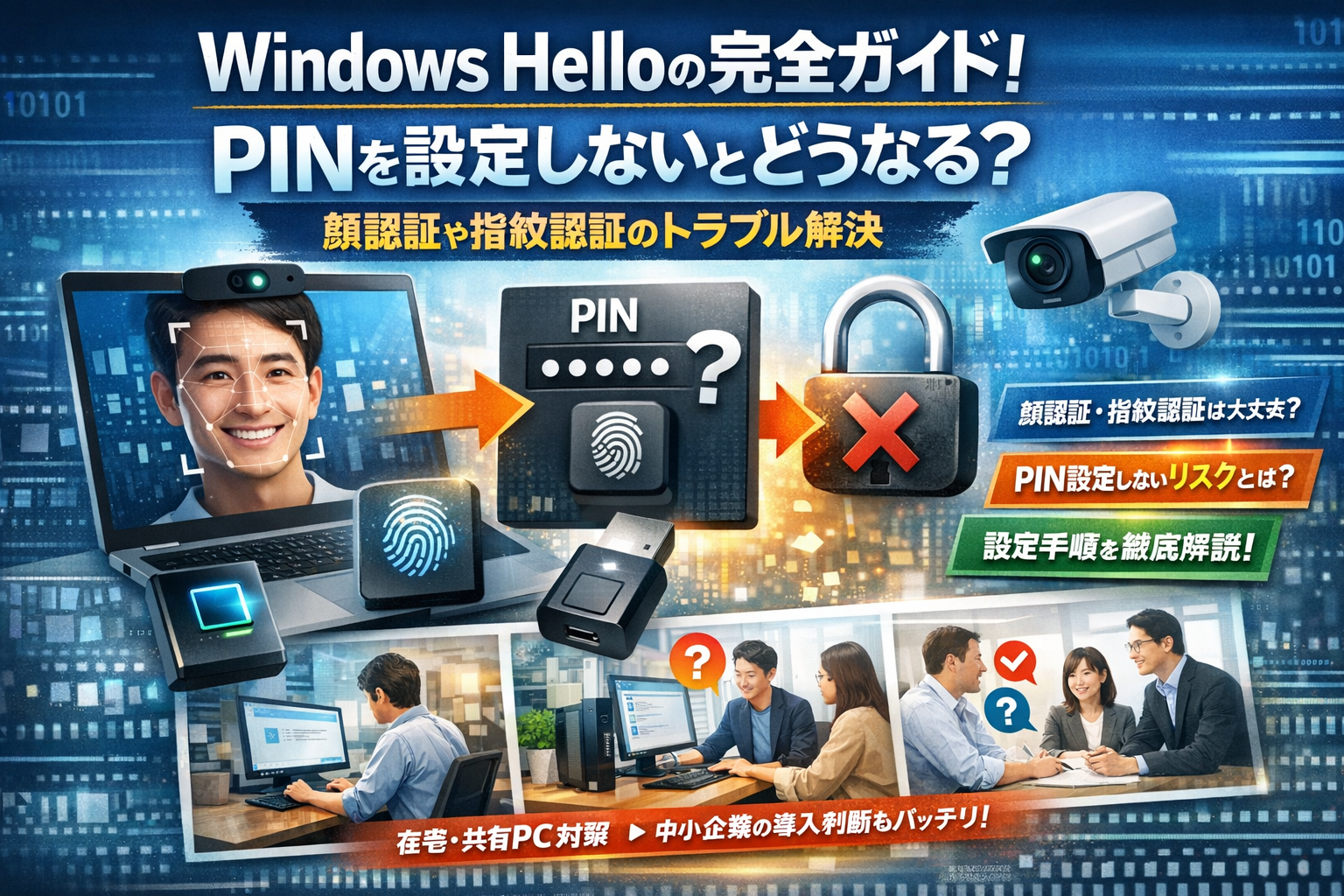 この記事では、そのときに整理しきれずに苦労したポイントを、実際に問い合わせで多いエラー表示やメッセージ単位に落とし込み、「この画面が出たら、何を確認し、どこまで任せてよいか」を一本で判断できる形にまとめています。顔認証カメラや指紋リーダーの選び方も、700社以上の支援で見てきた失敗パターンを踏まえ、「買ってから後悔しない」ラインをはっきりさせることを意図しました。PCや回線、社内ルールがバラバラな環境でも、安全にWindows Helloを使うか、あえて使わないかを、自信を持って選べる状態になってほしいという思いで書いています。