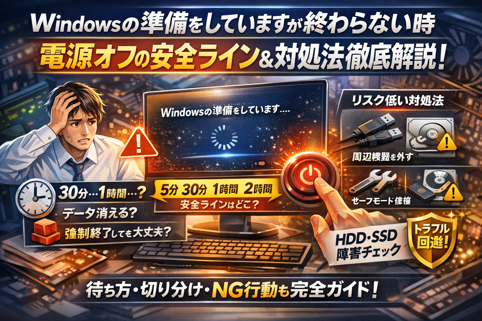 「Windowsの準備をしています」から動かないまま、何十分も画面とにらめっこしていませんか。仕事中のパソコンでこれが起きると、「どのくらい待つべきか」「今強制終了しても大丈夫か」「データは消えないか」を即断できないこと自体が、大きな損失になります。しかも一般的な対処法は「とりあえず待つか電源を切るか」の二択に矮小化され、待ち過ぎて業務が止まる人と、切り方を誤って障害を悪化させる人を量産しています。