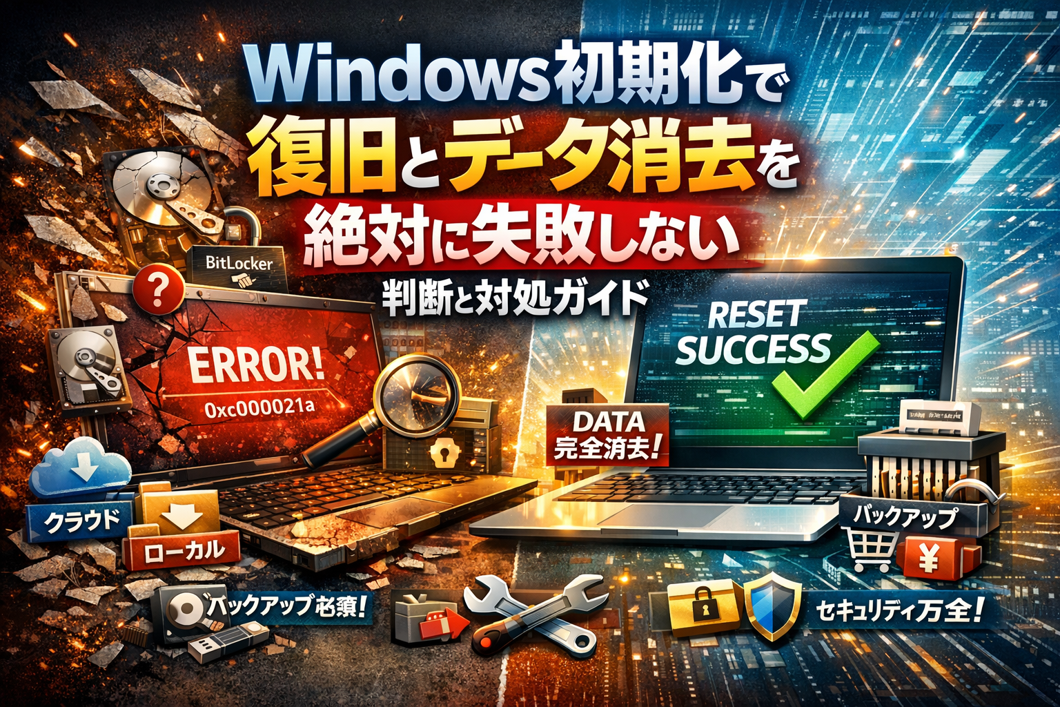 本記事では、単なる手順解説ではなく、初期化すべきかどうかの判断軸から入り、Windows10とWindows11の違い、クラウド再インストールとローカル再インストールの選び方、エラーでWindows初期化できないときの切り分け、DELLやdynabookやsurfaceなどメーカー別リカバリの落とし穴まで、実務で迷うポイントを一気に整理します。さらに、売却・譲渡・廃棄時にWindows初期化では消えないデータの現実、PCを工場出荷状態に戻す前に必須のバックアップとアカウント確認、初期化後に待ち受ける再設定の負荷まで、事前に把握しておくべき要素を網羅します。