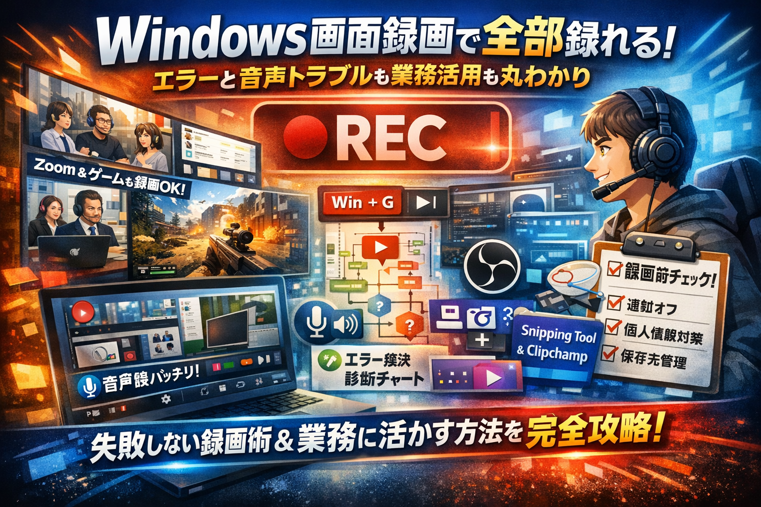 本記事では、Windows画面録画を手探りで試す時間を削り、最短で「業務に耐える録画環境」を組み上げることを目的にしています。Win+GやWin+Alt+Rなどのショートカットを使ったXboxゲームバーの基本操作から、Snipping ToolやClipchampでの画面収録、フリーソフトや専用ツールに切り替える判断軸までを一気通貫で整理します。