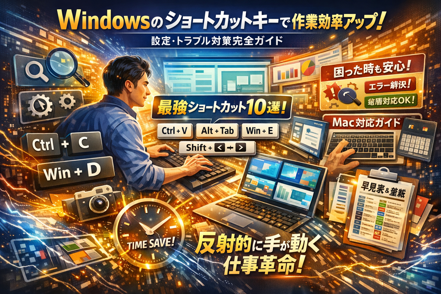 中小企業の支援現場で、Windowsのショートカットキーは「便利そうだけど、誰も使いこなしていない」テーマの代表格です。700社以上を見てきて、Ctrl+CとVだけで毎日を乗り切り、ウィンドウ切り替えやスクショ、検索をすべてマウスで追いかけている方を何度も見てきました。私自身も、複数のPCと回線を使う中で、Windows10と11が混在した環境でショートカットが効かず焦ったり、リモートデスクトップ越しに意図しないウィンドウが動いて作業を壊してしまった経験があります。さらに、社内で作った早見表やPDFが「配っただけ」で終わり、誰の手も動かないまま残業だけ増えていくケースも、支援中の企業で何度も目にしました。この状況を変えるには、一覧を増やすのではなく「最初の10個を、1週間で反射レベルにする」ことからやり直す必要があります。本記事では、2026年の今、現場で本当に使われている組み合わせと運用ルールに絞り込み、「ITが得意ではない人でも、明日から残業時間が目に見えて減る」レベルまで持っていくための道筋を整理しました。