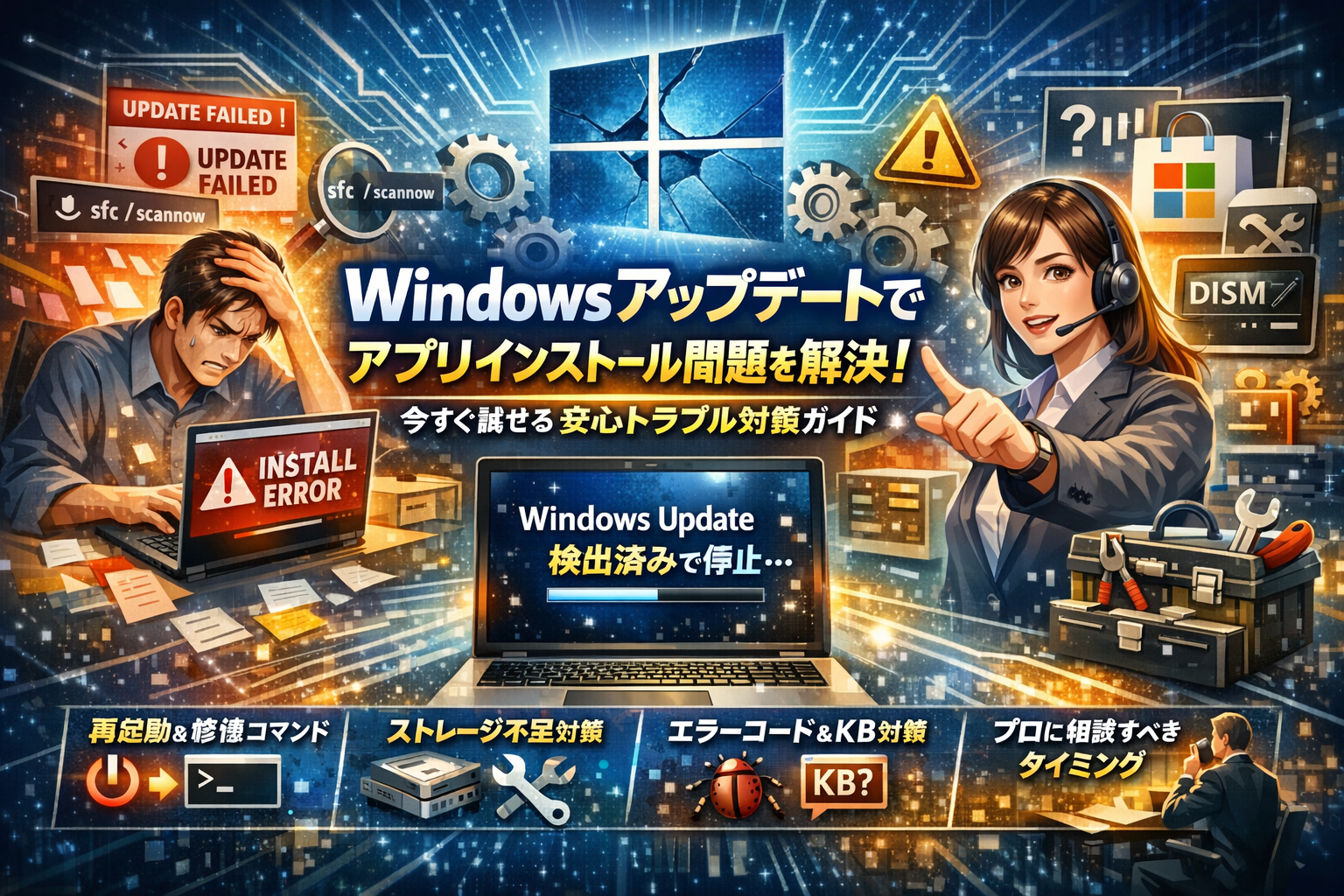 Windowsアップデートの後からアプリがインストールできない、アップデート失敗が繰り返す、Windows Update トラブルシューティングや「Windows Update で問題を解決する 今すぐ再インストール」を実行しても「検出済み」から進まない。この状態で作業を続けると、業務は止まるのに原因も撤退ラインも分からないまま時間だけが溶けていきます。