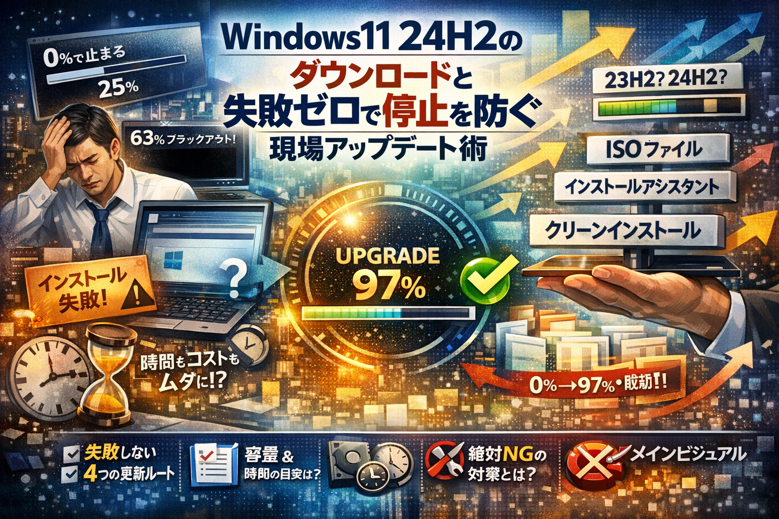 Windows11 24H2の「今すぐダウンロード」をなんとなく押すと、仕事用PCほど目に見えない損失が積み上がります。0%から進まない更新プログラム、24H2のダウンロードが遅いままの画面、インストール25%や63%で止まるブラックスクリーン。これらは「運が悪い」のではなく、事前の判断とルート選択を間違えた結果です。