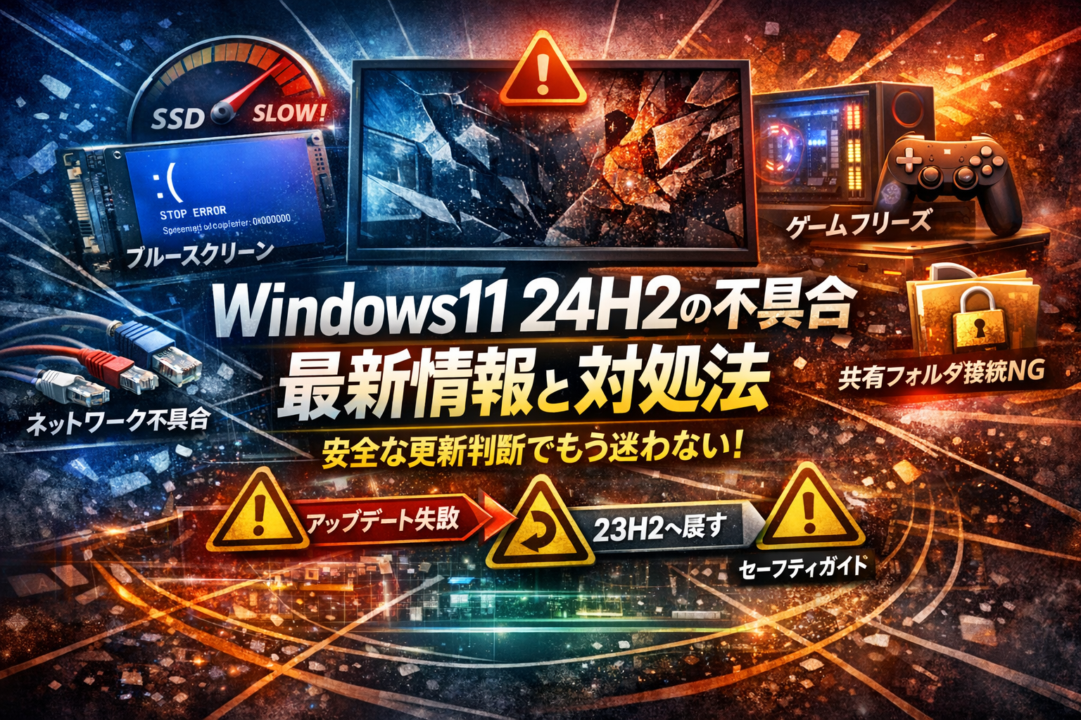 この記事では、Windows11 24H2 不具合の最新状況を「症状別」と「更新プログラム別」に整理し、SSDやネットワーク、ゲーム、リモートデスクトップ、SMB共有などの原因と実務的な対処を一本の線で結びます。さらに、24H2への強制アップデートを避けるタイミング設計、WindowsUpdateやWSUSでアップデート失敗を繰り返す場合の出口、どうしても安定しない時に23H2へ戻す現実的なルートまで、情シスと個人ユーザーの双方がそのまま運用に落とし込める形で解説します。読み終えた時点で、「今このPCを24H2に上げるべきか、見送るべきか」を迷わず判断できるはずです。