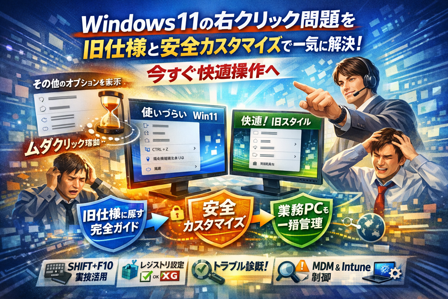 本記事では、一般的に紹介される旧仕様への戻し方やレジストリ編集の注意点を一度すべて整理したうえで、個人PCと会社PCでどこまでカスタマイズしてよいかの境界線を明確にし、Windows11 右クリックメニュー カスタマイズを安全に運用するための実務ロジックを提示します。Shift+F10など即効性の高い対処から、右クリックが効かない・表示されないときの診断、MDMやIntuneでの制御方針、部署間で仕様を標準化する考え方まで一気にたどれます。右クリック問題を「単なるUIの違和感」で終わらせず、ヘルプデスク負荷と社員のストレスを同時に削減する手順書として活用していただけます。