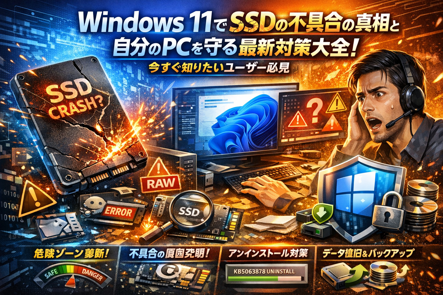 Windows 11アップデートで「SSDが突然死する」「SSD破壊バグ」といった言葉だけが独り歩きし、実際には何が危険で何が誤解なのかが見えないまま、貴重なデータと作業時間を静かに失っている人が増えています。MicrosoftやSSDメーカーはKB5063878や24H2と物理故障の直接の関連を否定していますが、現場では大容量ゲームのダウンロード中などにSSDが認識しない、ドライブがRAWになるといった報告が続いているのも事実です。噂を信じてWindowsアップデートを止め切るのも、逆に何も考えず最新パッチを入れ続けるのも、どちらもリスク管理としては雑すぎます。重要なのは、自分のPC環境がどのゾーンにいるのかを冷静に確認し、Windows 11 SSD不具合への対策とバックアップ運用をセットで最適化することです。この記事では、KB5063878や24H2の時系列整理から、SSDのメーカーやDRAMレスかどうかの確認方法、Windows 11でSSDだけ認識しない場合の原因切り分け、KB5063878のアンインストールができないときの実務的な回避策までを一気通貫で示します。在宅ワーカー兼ゲーマーや小規模オフィスでもそのまま使える「アップデート運用ルール」と「復旧のセーフライン」まで具体化しているので、読み終える頃には「何を止めて、何を続け、どこまで自力で対応するか」を即断できる状態になれます。