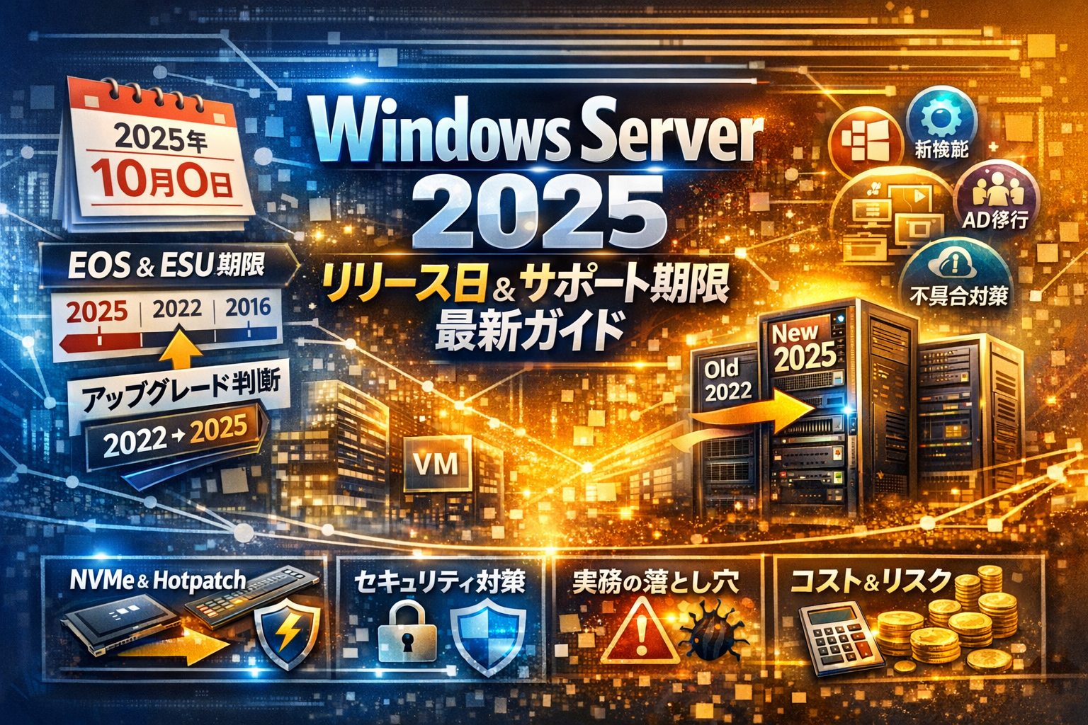 本記事では、Windows Server 2025の正式リリース日、日本語版としての実務的な検証開始タイミング、24H2/25H2やWindows 11との関係をまず整理します。そのうえで、サポート期限一覧からEOSとESUを俯瞰し、サポート期限延長の落とし穴、新機能やホットパッチ・NVMe・LTSCの「効くところだけ」を抽出します。さらに、既知の不具合傾向とAD移行・GPO・WSUS運用で実際に起きがちなトラブル、VM検証ステップ、規模別シナリオ診断、経営陣を動かす説明テンプレートまで一気に並べます。