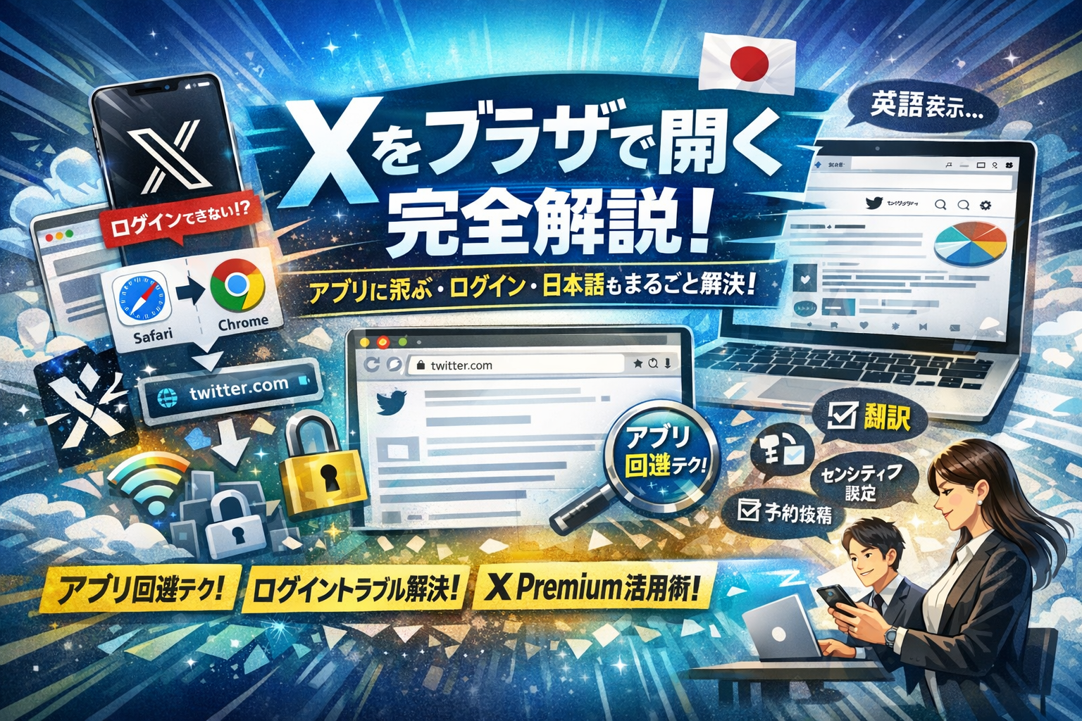 本記事では、Xをブラウザで開く最短手順から、「アプリに飛ぶ」設定のリセット方法、ブラウザ版でログインできない・見れないときの安全な解決フロー、Xブラウザ版の日本語表示と翻訳の整理、センシティブ設定や閲覧履歴の実態までを一気通貫で解説します。さらに、複数アカウント運用や予約投稿、X Premiumを含むマーケティング活用を、スマホとPCの環境ごとにどう設計すべきかも具体的に示します。X ブラウザの扱いを誤ると、小さな設定ミスが誤投稿や情報漏えいに直結します。この1本を押さえておけば、現場で迷わず「壊さない直し方」と「安全な運用ルール」をそのまま社内に展開できます。