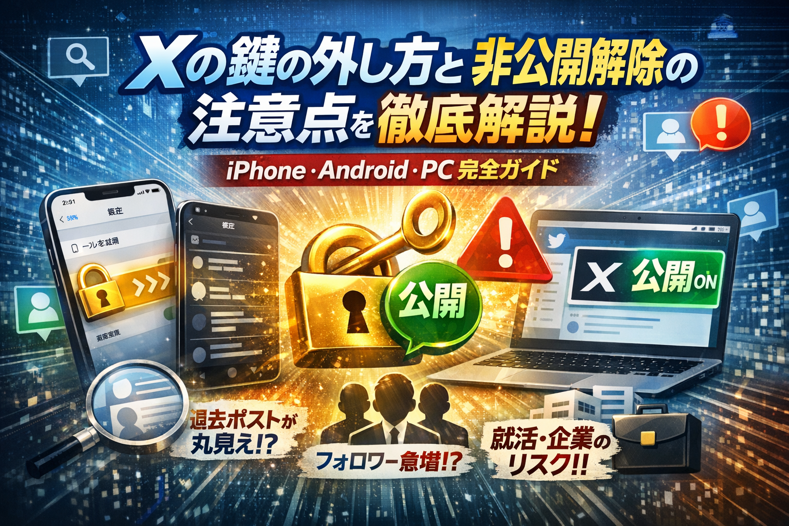 Xの鍵マークを今すぐ外したいのに、最新の画面と合わない解説や「iPhoneとAndroidとPCでやり方が違う」情報に振り回されていませんか。多くの記事はXの鍵の外し方だけをざっくり説明して終わりますが、非公開解除の瞬間に過去ポストが一気に検索で拾われることや、就活・企業アカウントでの評価リスク、会社PCのネットワーク設定が原因で「X非公開解除できない」ケースまでは踏み込んでいません。